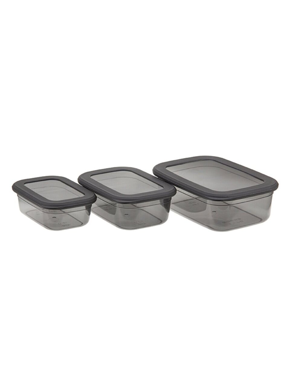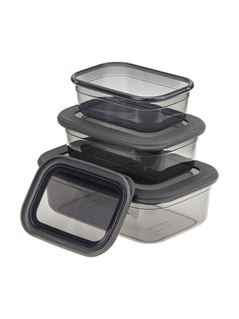 В наборе три квадратных контейнера объемом 0.4, 0.7 и 1.2 литра. Все емкости выполнены в стильном графитовом цвете, легко складываются друг в друга для хранения.