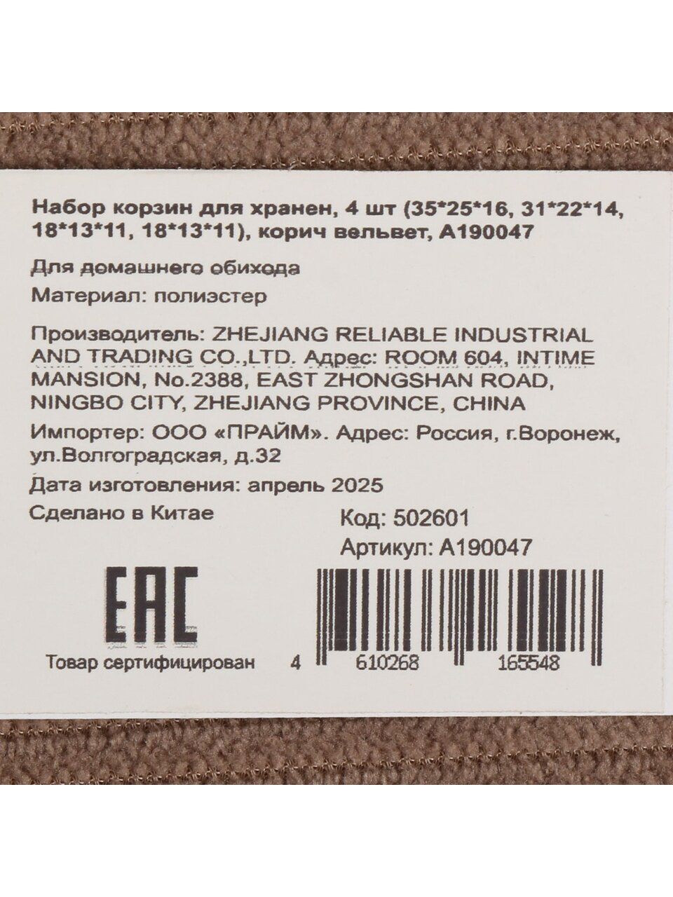 Вы можете приобрести «Набор корзин 4 шт, для хранения, прямоугольный, вельвет, коричневый, 35х25х16, 31х22х14, 18х13х11, 18х13х11 см, A190047» и другие товары в нашем интернет-магазине в Курске по низким ценам и с бесплатным самовывозом.