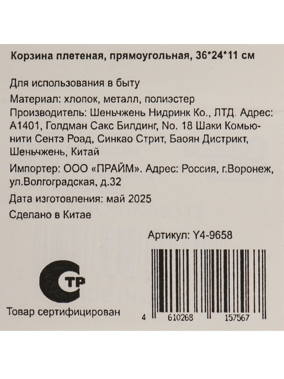 Корзина плетеная, прямоугольная, 36*24*11 см, Y4-9658