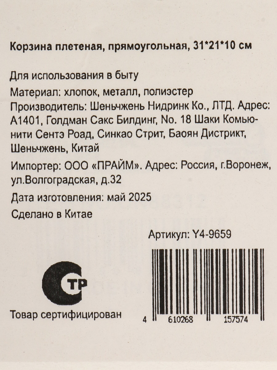 Корзина плетеная, прямоугольная, 31*21*10 см, Y4-9659