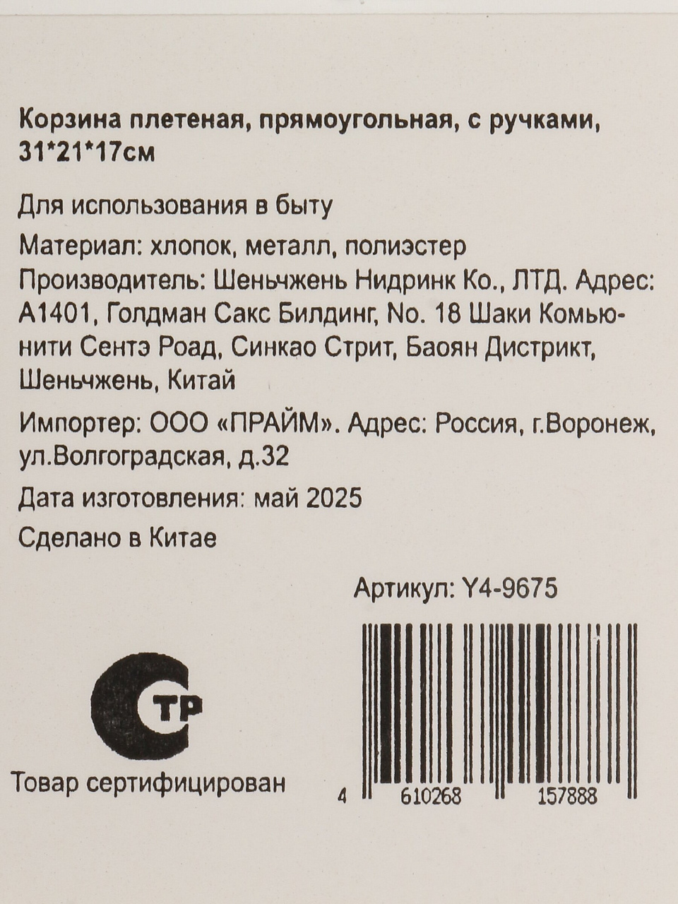 Корзина плетеная, прямоугольная, с ручками, 31*21*17 см, Y4-9675