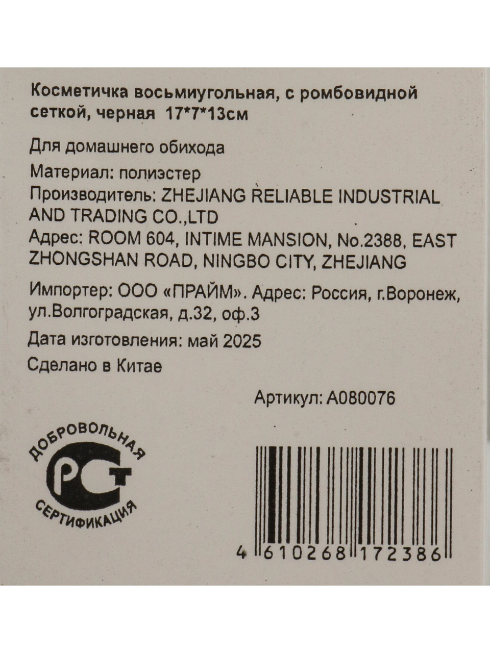 Косметичка восьмиугольная, с ромбовидной сеткой, черная 17Х7Х13см, A080076