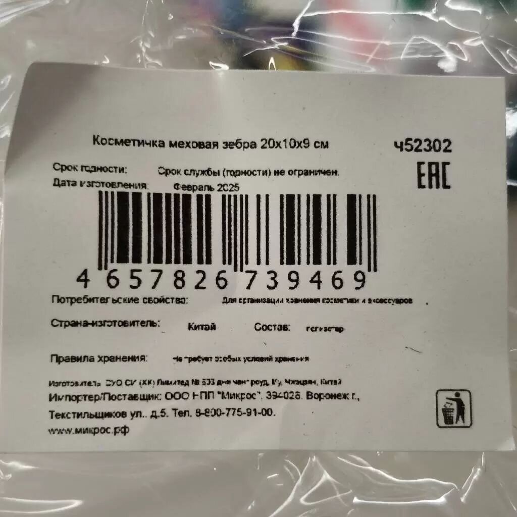 Стильная косметичка 20х10х9 см из мягкого меха с оригинальным зебровым узором — практичный аксессуар для хранения косметики и мелочей дома или в поездках. Прямоугольная форма, надежная молния и материал полиэстер обеспечивают удобство и долговечность. Яркий дизайн украсит интерьер и подчеркнет индивидуальность.