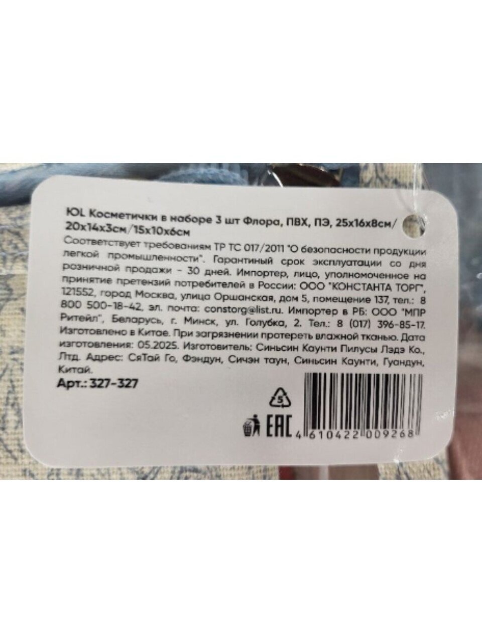 В комплекте три косметички: 25х16х8 см, 20х14х3 см, 15х10х6 см. Все они компактны, подходят для ручной клади и легко помещаются в сумку или чемодан.