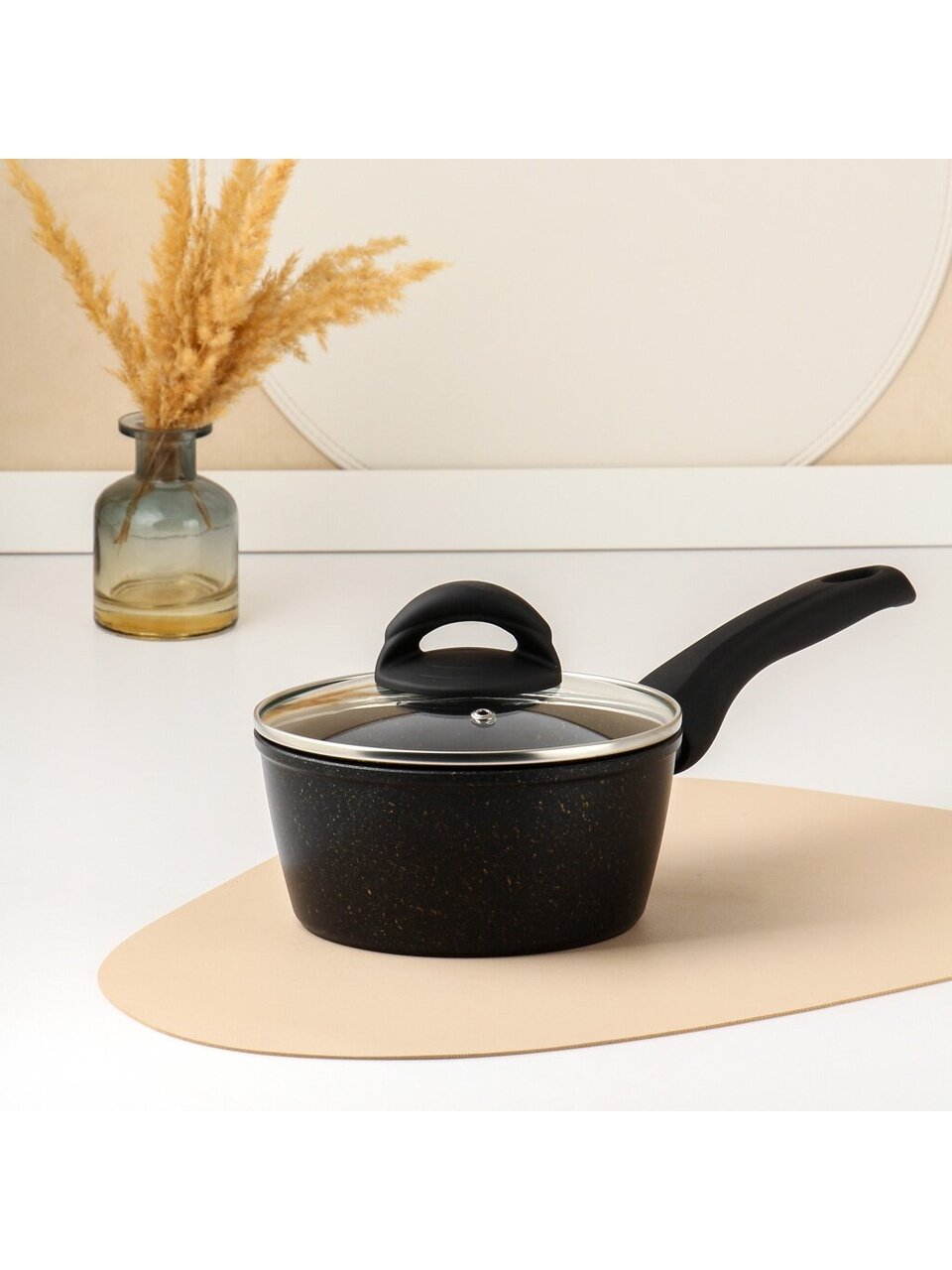 Объем 1.2 литра позволяет готовить разнообразные блюда, а стеклянная крышка обеспечивает контроль за процессом приготовления, не открывая посуду. Пластиковая ручка, надежно закрепленная на корпусе, не нагревается, что обеспечивает безопасность и комфорт в использовании. Ковш совместим с индукционными плитами, что делает его универсальным решением для любой кухни.