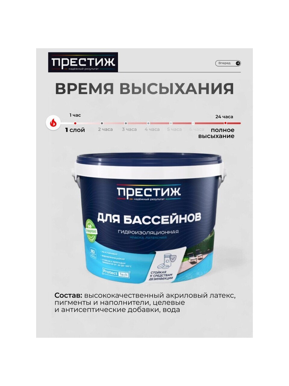 Краска латексная Престиж подходит для наружных и внутренних работ. Обеспечивает защитное и декоративное окрашивание поверхностей бассейнов, декоративных фонтанов, ландшафтных скульптур из бетона, железобетона, подверженных длительному воздействию воды. Для наружных и внутренних работ. Допускается применение на горизонтальных поверхностях, где образуется отстой воды.