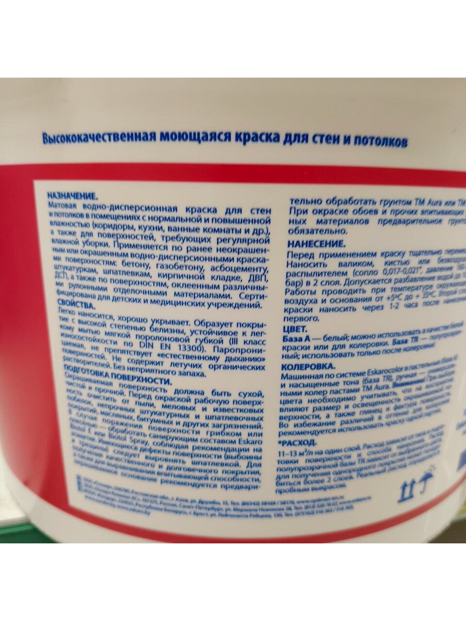 Вы можете приобрести «Краска водно-дисперсионная, Aura, Mattlatex, акриловая, универсальная, моющаяся, влагостойкая, матовая, 9 л» и другие товары в нашем интернет-магазине в Серпухове по низким ценам и с бесплатным самовывозом.