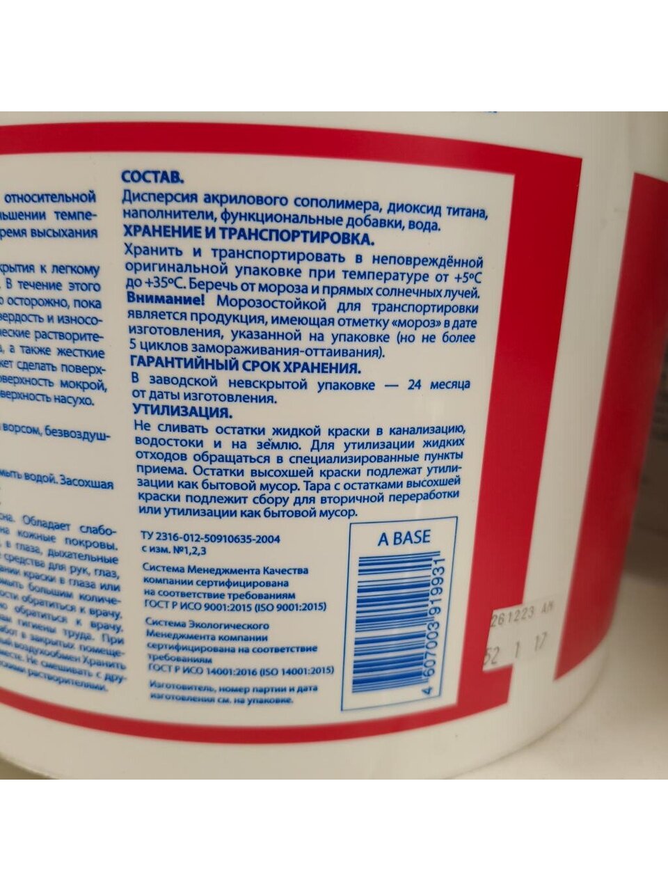 Матовая водно- дисперсионная краска для стен и потолков в помещениях с нормальной и повышенной влажностью (коридоры, кухни, ванные комнаты и др.), а также для поверхностей, требующих регулярной влажной уборки. Применяется по ранее неокрашенным или окрашенным водно - дисперсионными красками поверхностям: бетону, газобетону, асбоцементу, штукатуркам, шпатлевкам, кирпичной кладке, ДВП, ДСП, а также по поверхностям, оклеенным различными рулонными отделочными материалами. Сертифицирована для детских и медицинских учреждений.