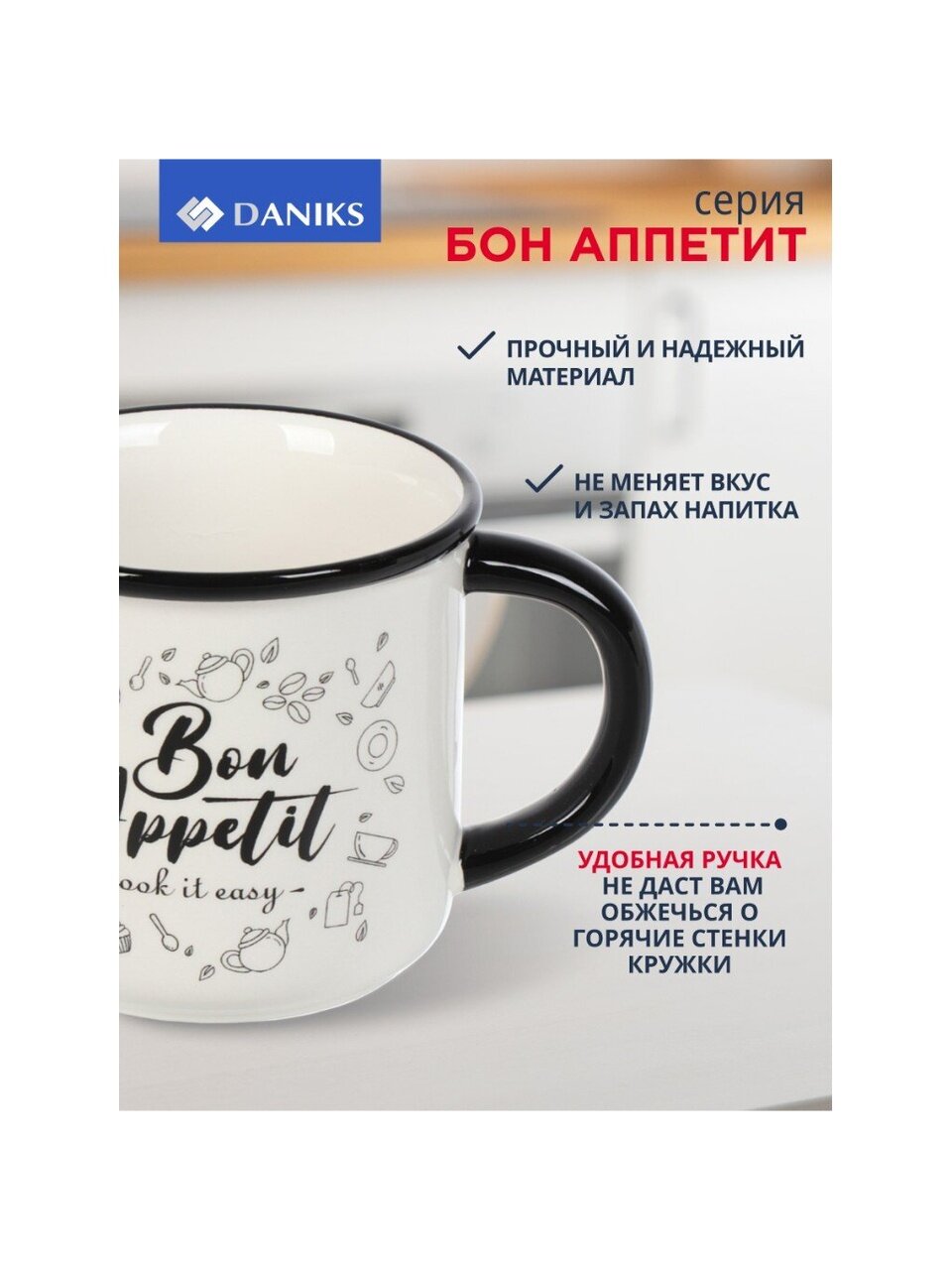 Керамическая кружка Daniks «Бон Аппетит» 350 мл — стильный выбор для дома и офиса: подходит для СВЧ, легко моется, универсальный дизайн для любого интерьера.