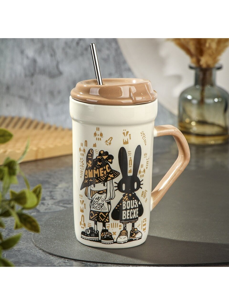 Керамическая кружка 580 мл «Кролики тренд» с крышкой и трубочкой — стильный подарок в подарочной упаковке для уютных чаепитий дома и на даче