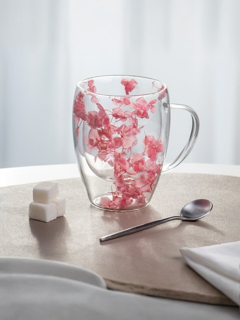 Стеклянная кружка с двойными стенками объемом 350 мл — стильный аксессуар для дома и офиса. Дизайн с розовыми сухоцветами подчеркнет индивидуальность и украсит любой современный интерьер. Наслаждайтесь любимыми напитками, сохраняя их температуру дольше и не обжигая руки.