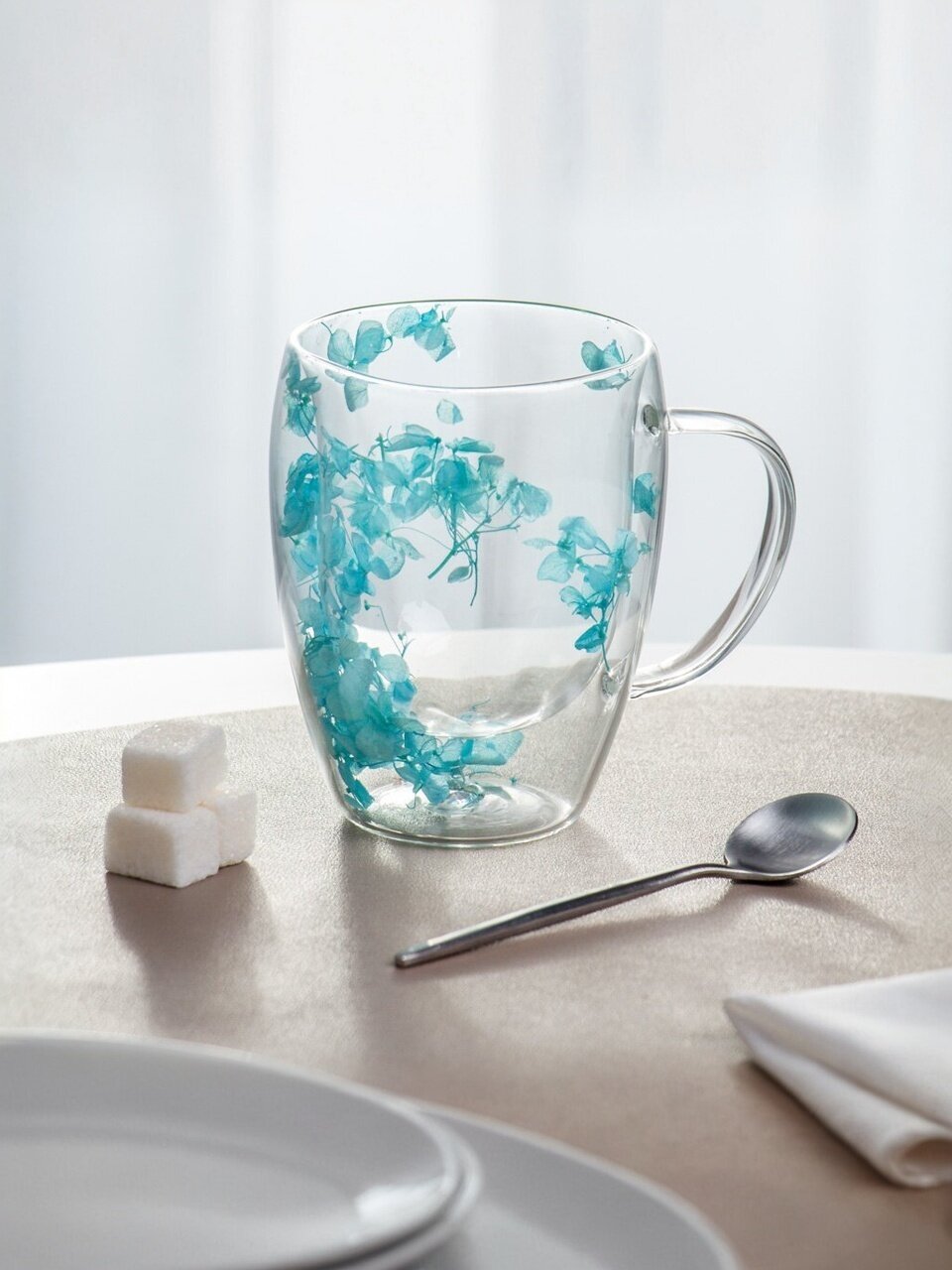 Кружка стекло с двойными стенками "Голубые лепестки" — стильный аксессуар для современной кухни. Элегантный дизайн и прозрачность подчёркивают красоту напитка, а двойные стенки сохраняют тепло и защищают руки от жара. Идеальный подарок для женщины, мамы, подруги или коллеги на 8 марта и каждый день.