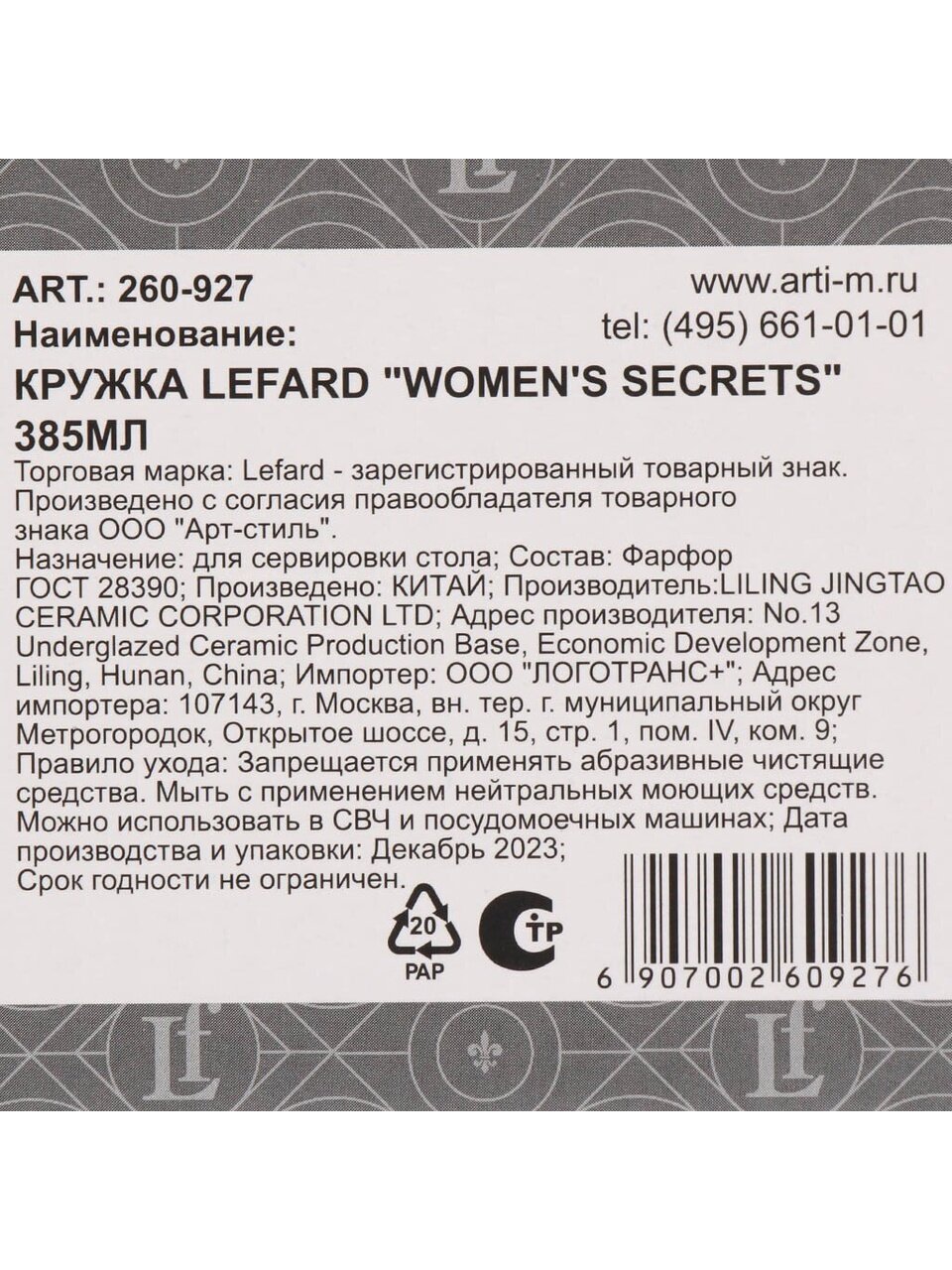 Подбирая кружку для подарка или личного пользования, многие сравнивают варианты: чем отличается фарфор от керамики? Фарфор легче, изящнее, устойчив к царапинам и перепадам температуры. Lefard — бренд с репутацией, а Women's Secrets — коллекция, созданная для женщин, ценящих детали.