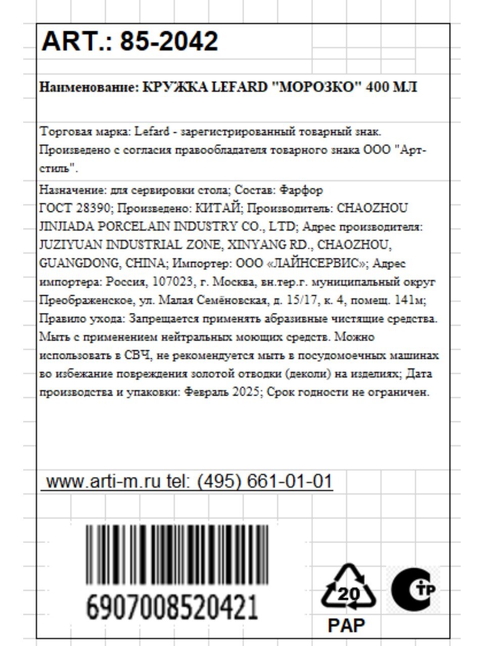 Объём кружки — 400 мл, материал — белый фарфор без эмалевого покрытия. Артикул: 85-2042.