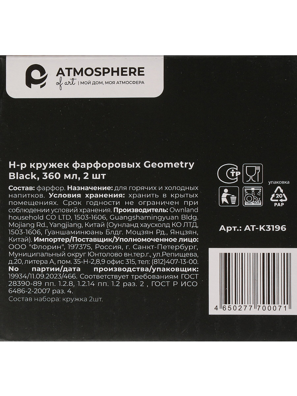 Вы можете приобрести «Кружка фарфор, 2 шт, 360 мл, Geometry Black, Atmosphere, AT-K3196» и другие товары в нашем интернет-магазине в Армавире по низким ценам и с бесплатным самовывозом.