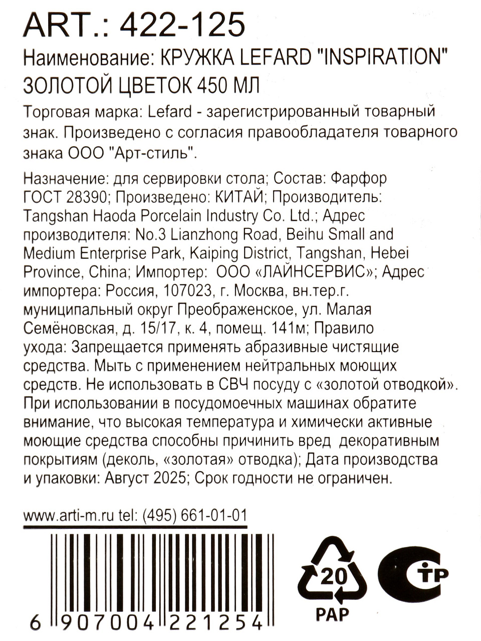 Вы можете приобрести «Кружка фарфор, 450 мл, Inspiration Золотой цветок, Lefard, 422-125» и другие товары в нашем интернет-магазине в Ярославле по низким ценам и с бесплатным самовывозом.