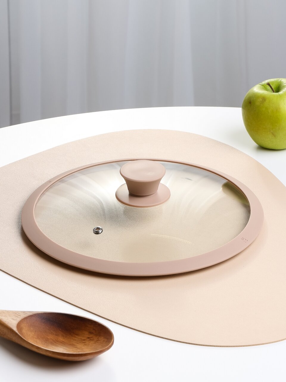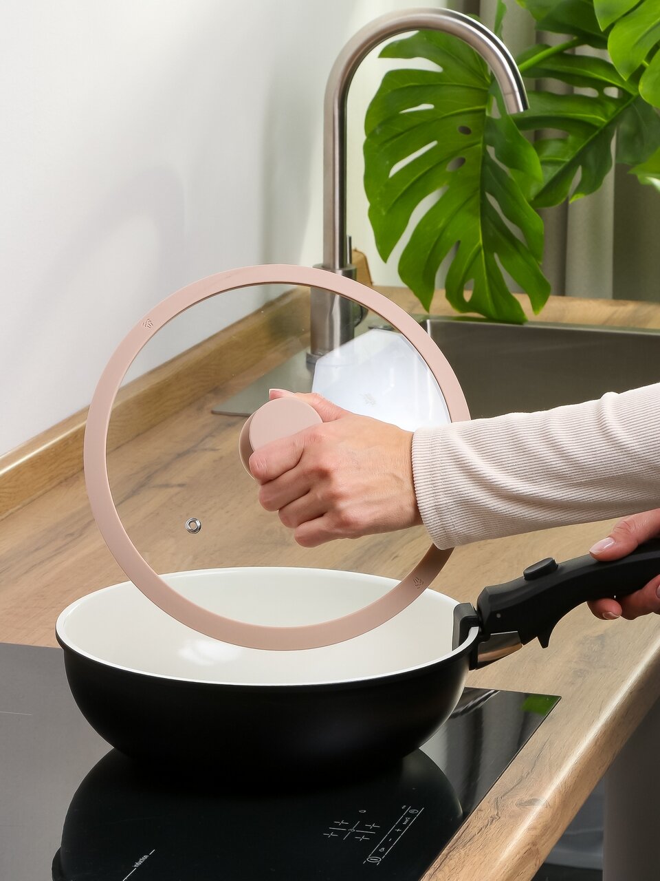 - Оптимальный диаметр 24 см — подходит для большинства кастрюль, сковород и сотейников, легко мыть вручную и в посудомоечной машине