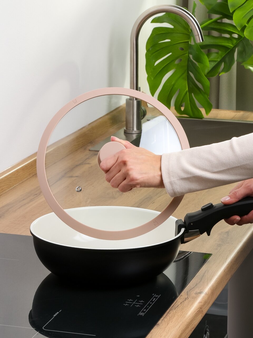 Измерьте внешний диаметр вашей кастрюли или сковороды. Крышка Daniks подходит для посуды с диаметром 26 см, благодаря силиконовому ободу плотно фиксируется на краях.