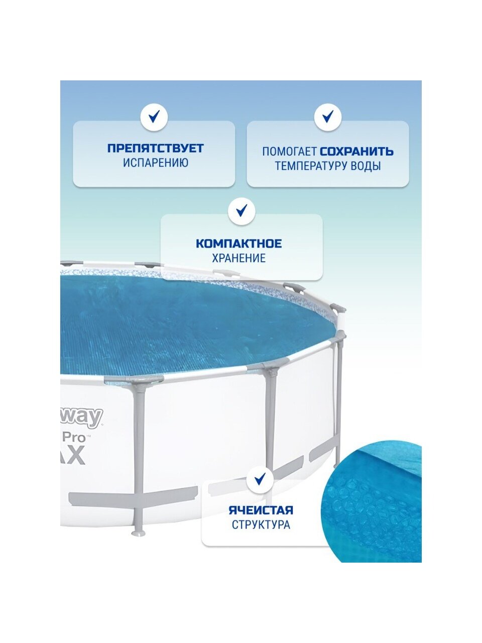 Тент Bestway 58252 подходит для всех типов бассейнов благодаря своей универсальной форме и размеру. Прозрачная пленка голубоватого оттенка с воздушными пузырьками размещается непосредственно на поверхности воды, создавая дополнительный согревающий эффект. Это позволяет значительно сократить расходы на подогрев воды, что станет весомым преимуществом для владельцев бассейнов.