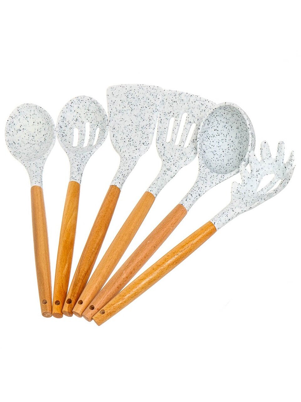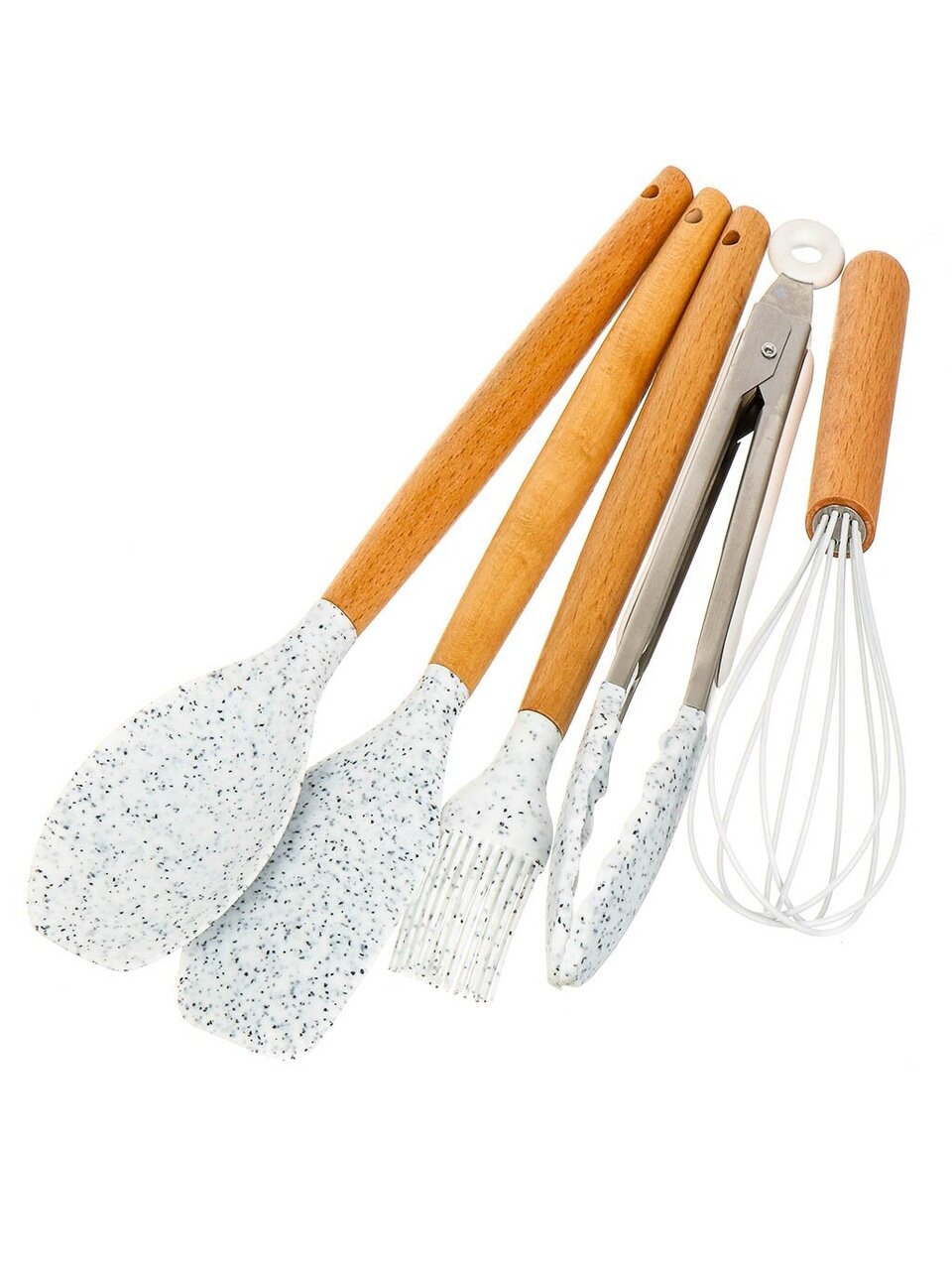 Красивый, функциональный и долговечный набор кухонных принадлежностей, который будет отлично смотреться на вашей кухне. Это незаменимый помощник для каждой хозяйки, желанная вещь для тех, кто любит готовить. Рабочая часть выполнена из силикона, что гарантирует долгий срок службы.