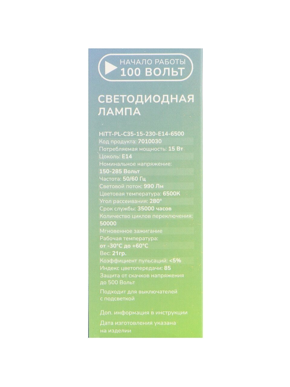 В отличие от классических ламп накаливания и дешёвых LED-аналогов, HiTT-PL-C35-15-230-E14 сочетает низкое энергопотребление (15 Вт при световом потоке 990 лм) и долгий срок службы до 35 000 часов. Это выгодно для тех, кто ищет лампу с маленьким цоколем для дачи, кухни или спальни. Лампа не нагревается и безопасна для закрытых светильников. Если вы ищете, что лучше для общего освещения или как выбрать лампу с нужной температурой света — 6500 К обеспечит яркое, но не холодное освещение без мерцания.