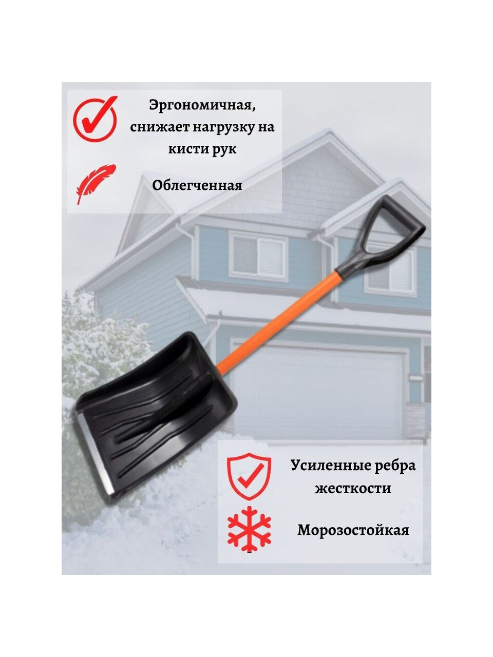 - Легкая и манёвренная: пластиковый ковш с закруглёнными краями упрощает сбор и выброс снега, снижая нагрузку на спину
