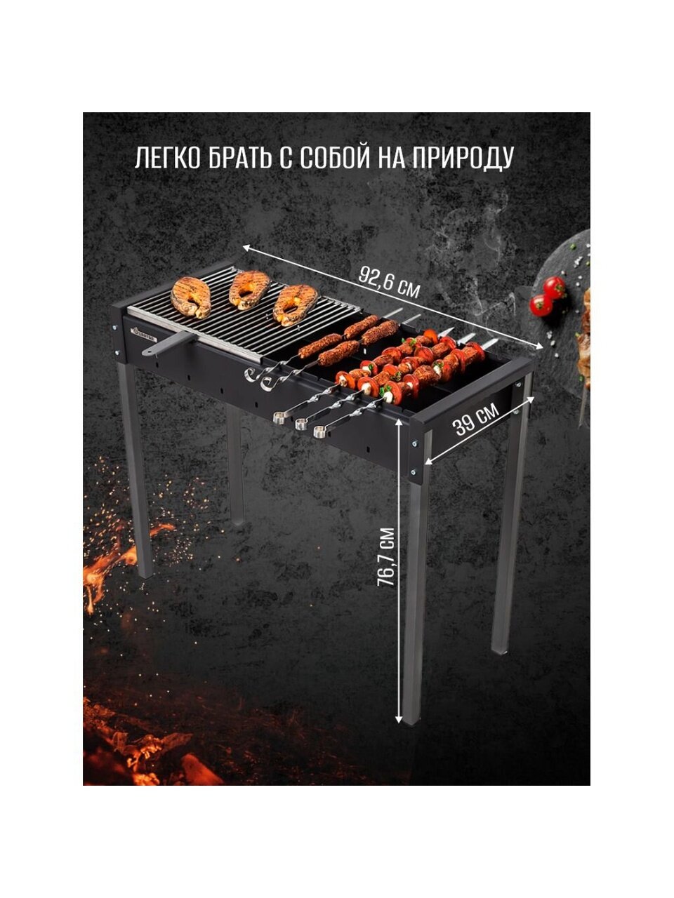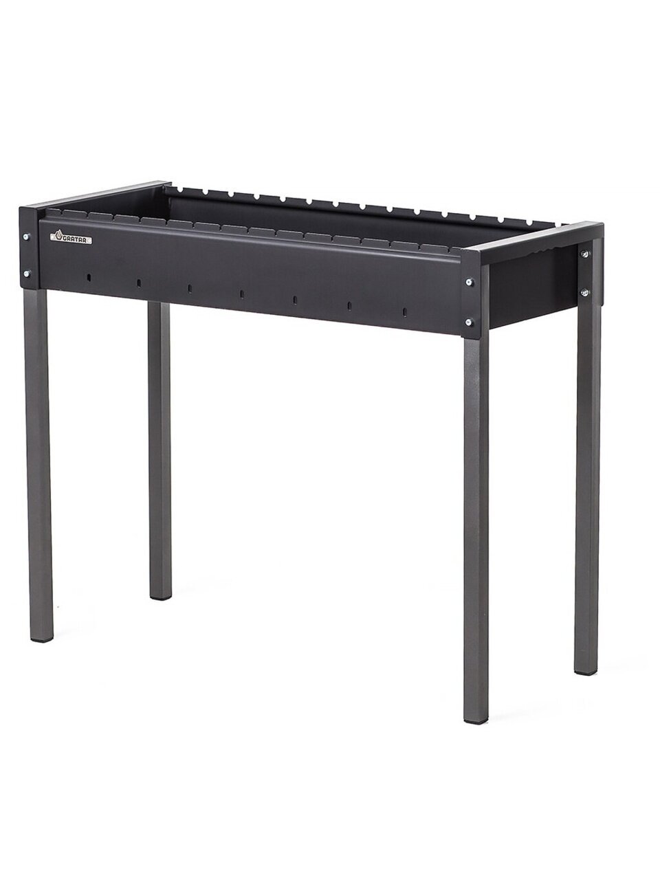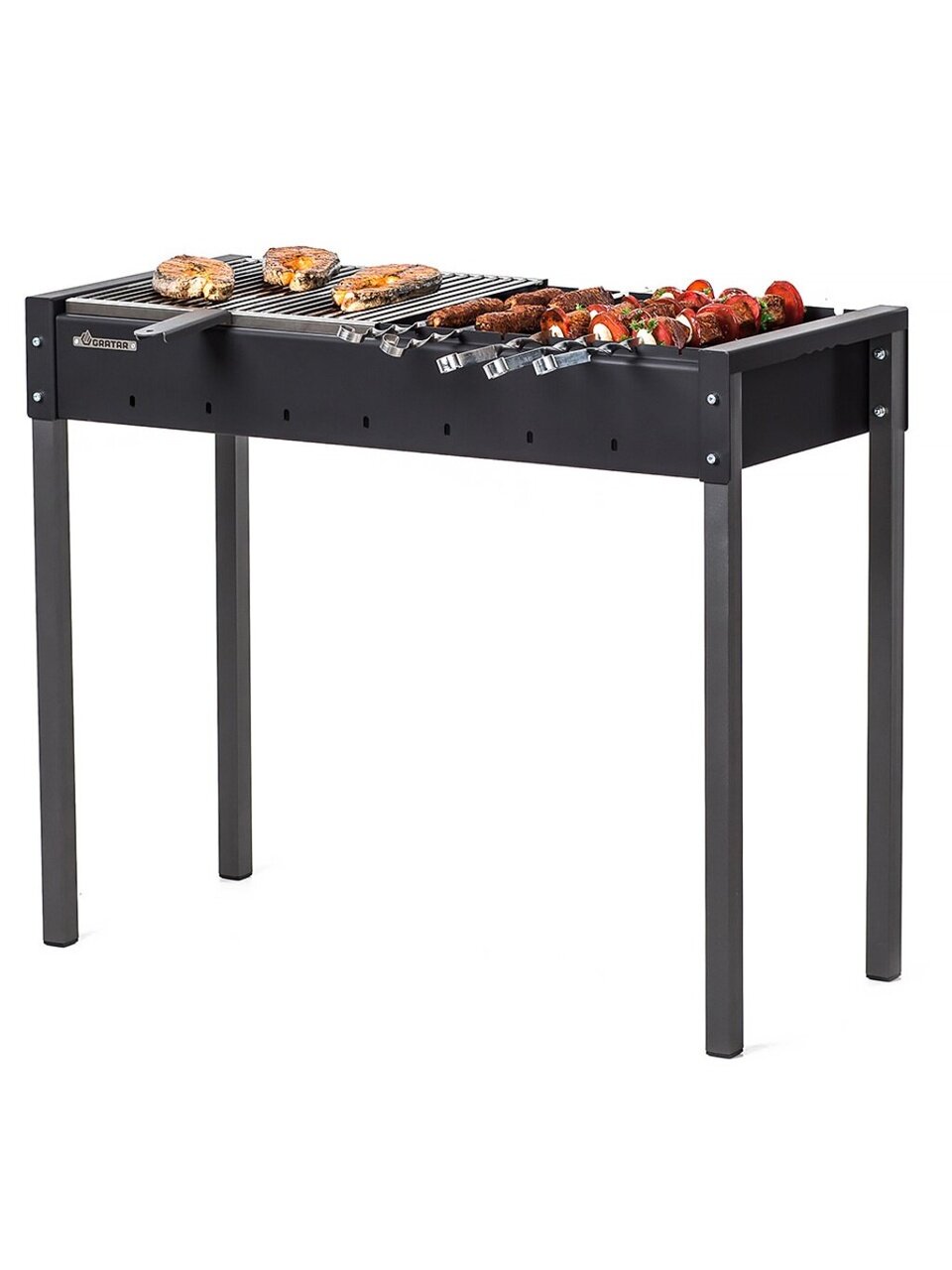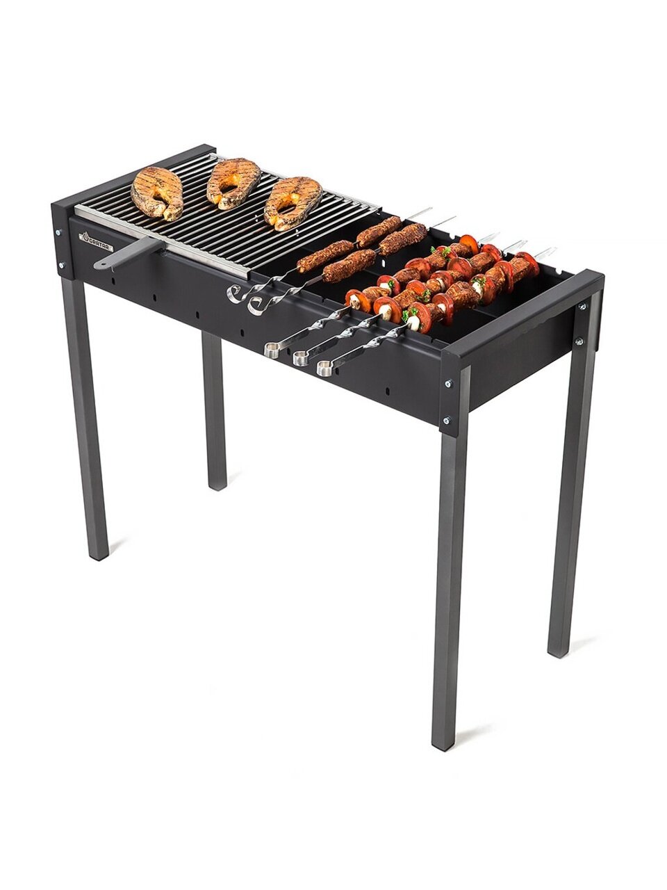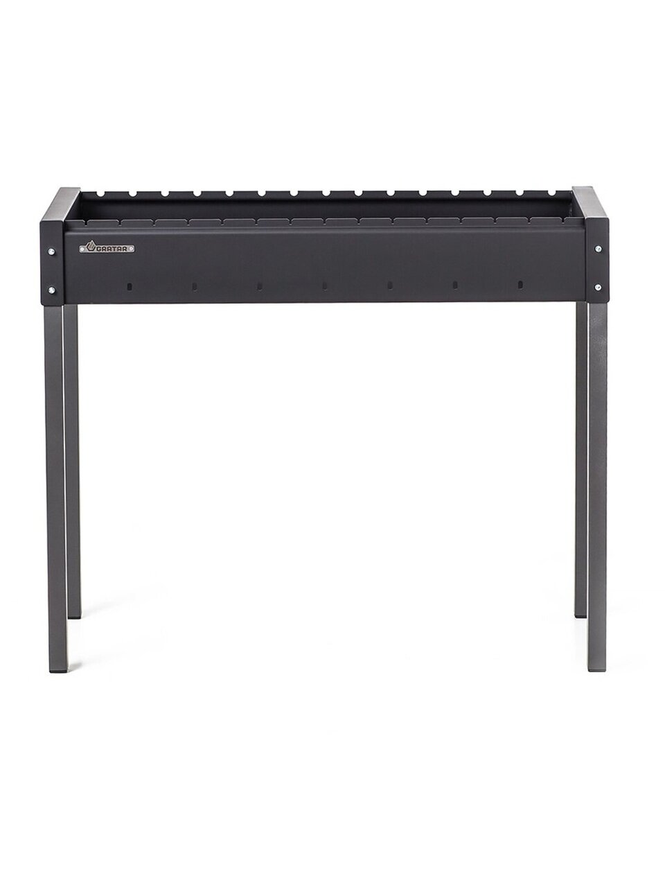 Мангал серии МАН 301 от компании Gratar позволяет готовить на живом огне с использованием дров. Он изготовлен из толстой высококачественной стали, которая выдерживает высокие температуры, а его специальная конструкция с усиленными рёбрами жёсткости предотвращает температурную деформацию. 15 посадочных мест для шампуров обеспечивают плавную регулировку угла поворота. 4 кг мяса можете приготовить одновременно. Многофункциональный передвижной мангал окрашен термостойкой эмалью выдерживающей температуру до 800 градусов цельсия.