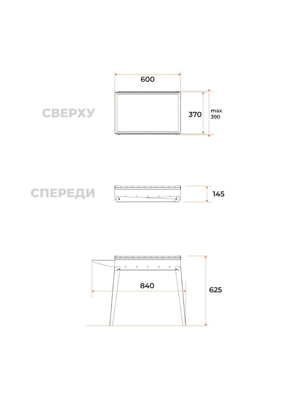 Длина мангала — 850 мм, рабочая длина — 590 мм, ширина — 380 мм, высота — 610 мм. Такой размер позволяет разместить до 10 шампуров одновременно.