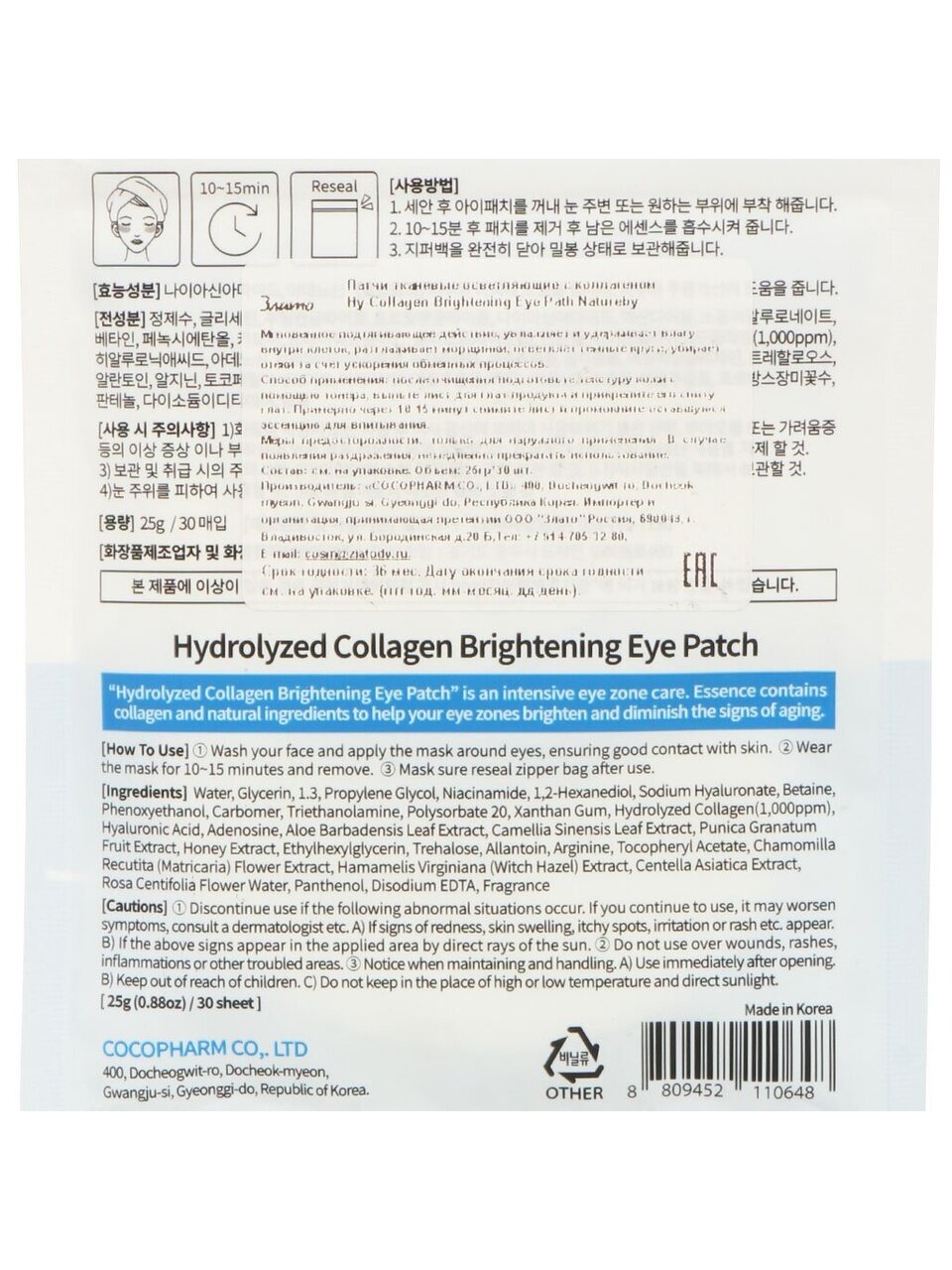 Патчи изготовлены из мягкого нетканого материала, пропитаны эссенцией с коллагеном и осветляющими экстрактами. Срок годности — 3 года с даты производства, хранить при температуре до +25°C.