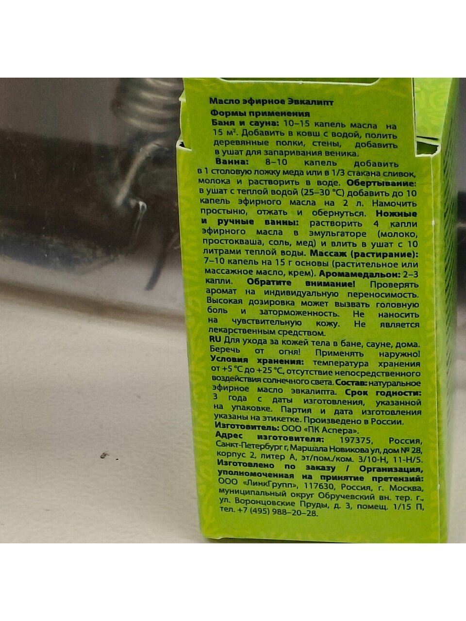 - Состав: 100% натуральное эфирное масло эвкалипта;
