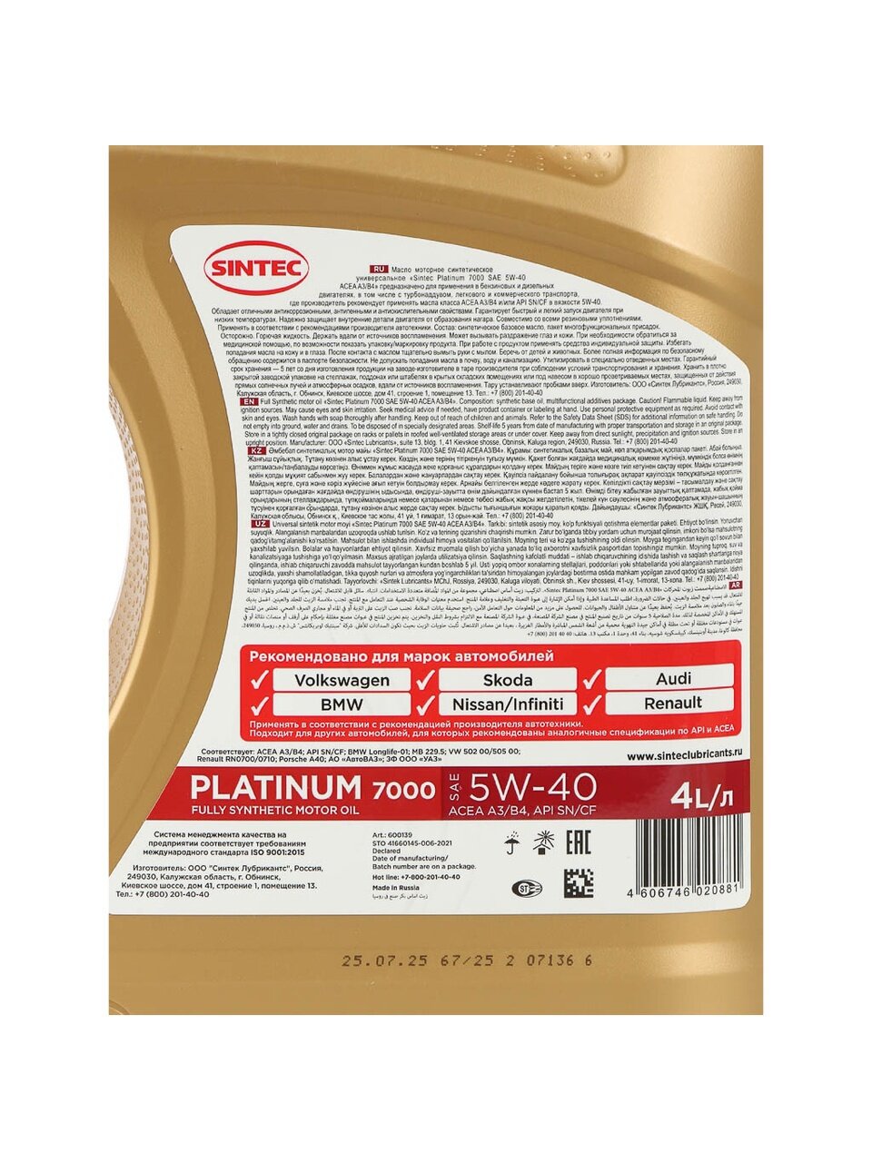 Синтетическое моторное масло 5W40 Sintec Platinum 7000 — надёжная защита двигателя в любых погодных условиях, экономия топлива и ресурс до 15 000 км.