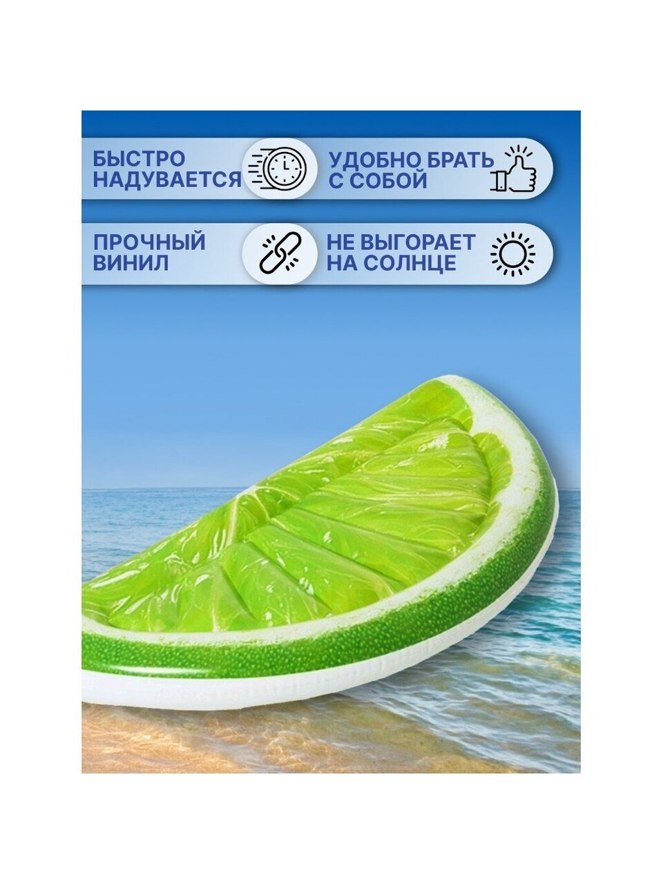 Получите сладкий вкус тропиков с помощью матраса для плавания Bestway Тропический лайм! Яркий, запоминающийся дизайн отлично подойдет к лайму в вашем напитке. В следующий раз, когда вы будете у бассейна, озера или на пляже, плавающий матрас Bestway Тропический лайм непременно произведёт фурор.