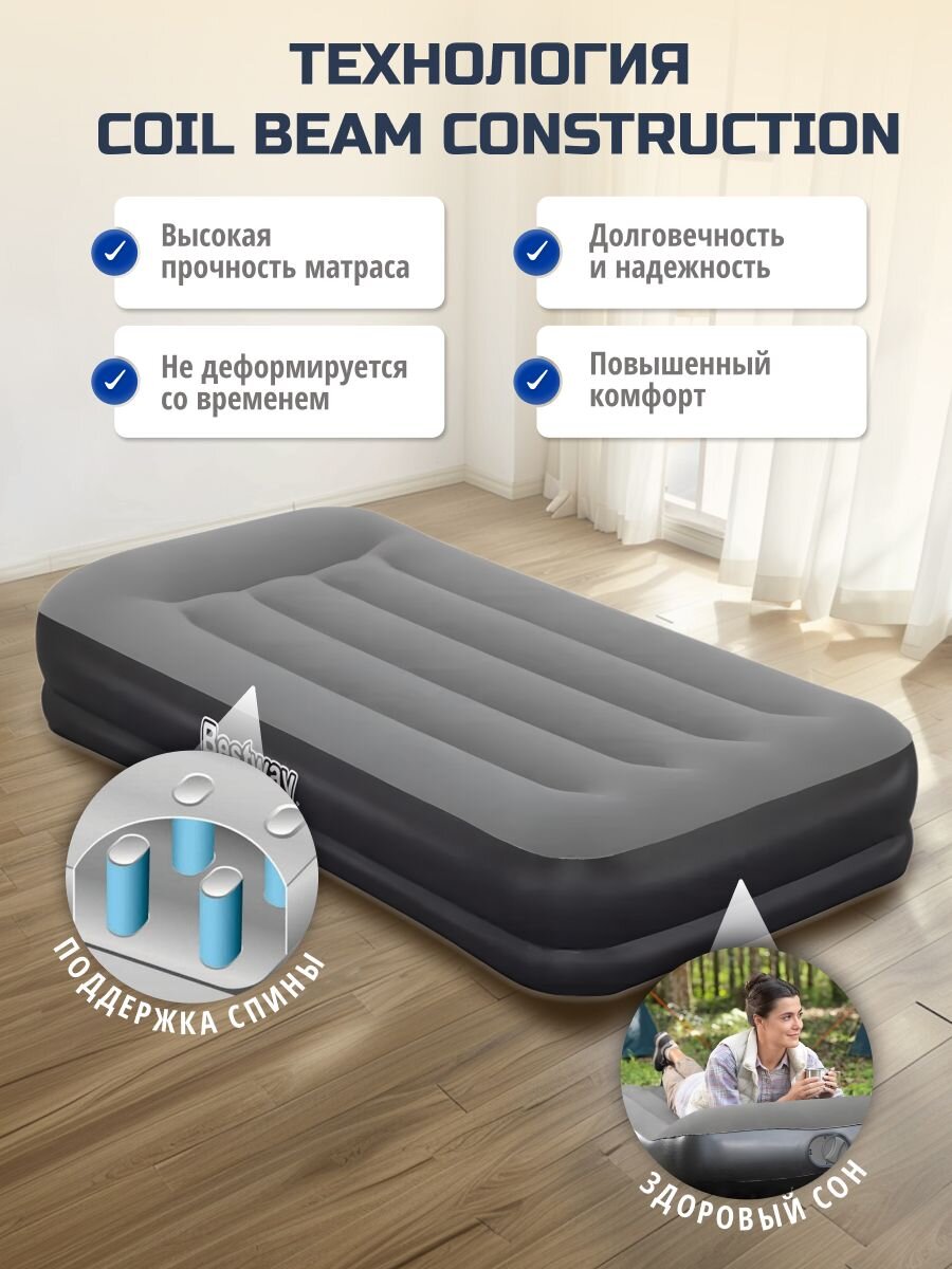 Надувной матрас Bestway отличается современным дизайном и высококачественными материалами. Его размеры 191х97х36 см позволяют разместиться с комфортом и насладиться полноценным отдыхом. Флокированное покрытие добавляет мягкости и предотвращает скольжение постельного белья, что делает сон еще более приятным.