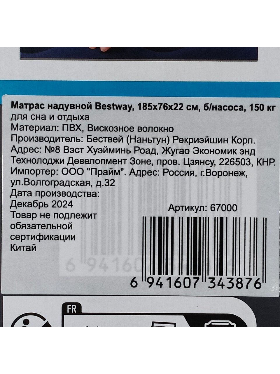 Вы можете приобрести «Матрас надувной Bestway, 185х76х22 см, 67000/010163BW, без насоса, флокированный, ортопедический, 150 кг» и другие товары в нашем интернет-магазине в Курске по низким ценам и с бесплатным самовывозом.