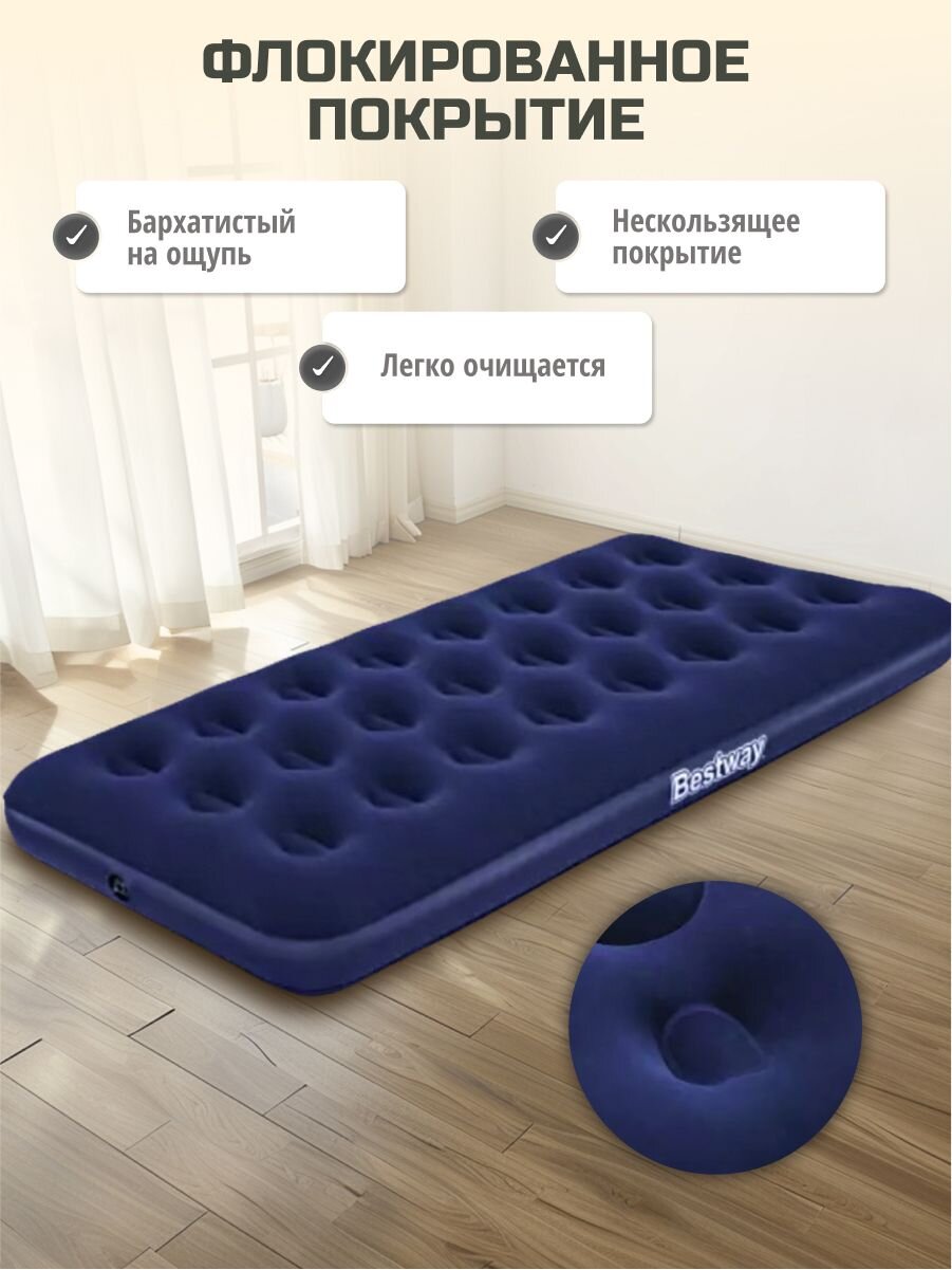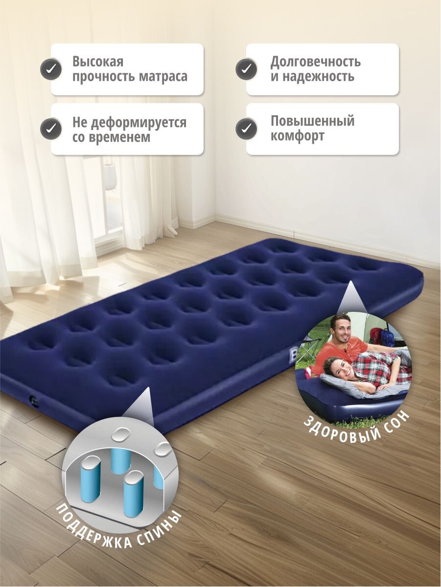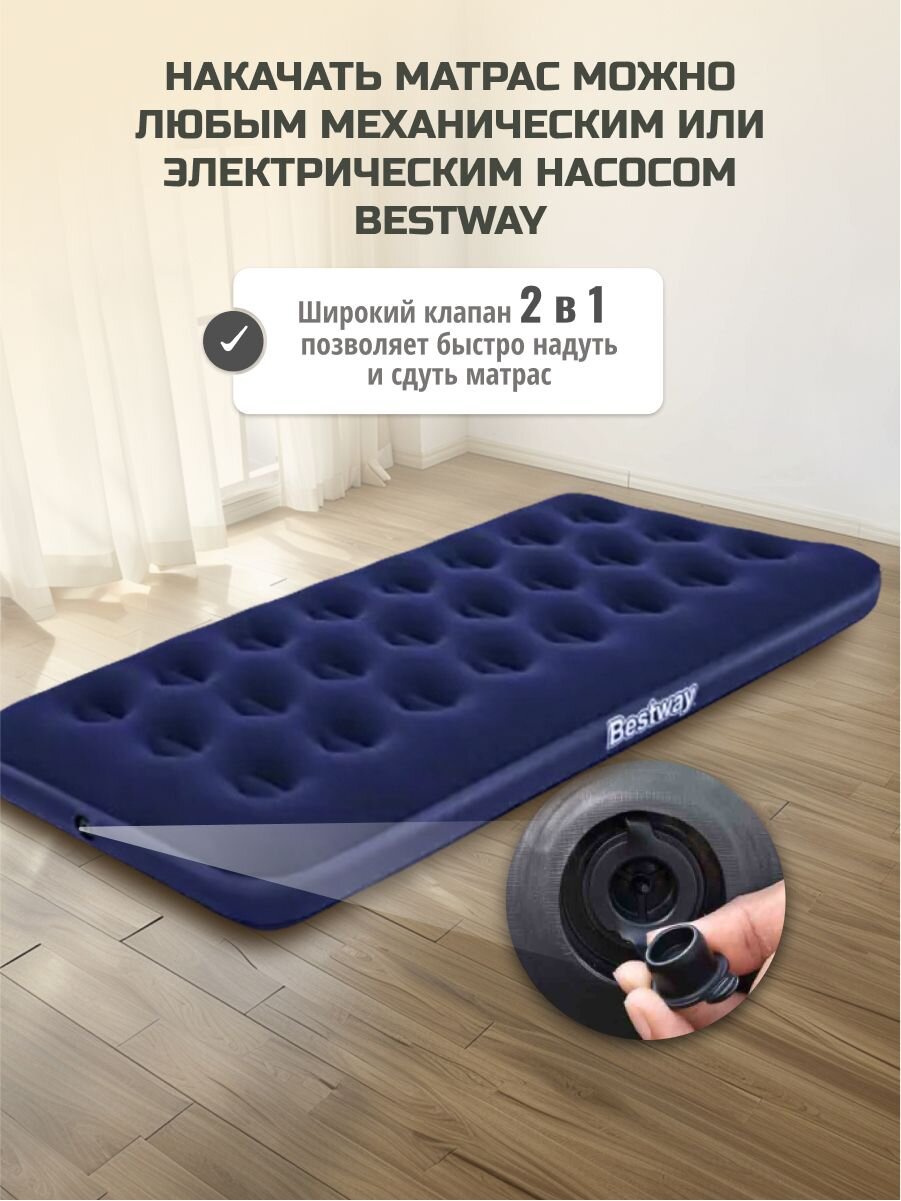 Матрас Bestway, выполненный из прочного флокированного винила, обеспечивает комфортный и здоровый сон в любых условиях. В случае, если свободного пространства в квартире или доме недостаточно, а гости наведываются часто, то надувные матрасы способны стать превосходным решением проблемы. Разместить гостей с комфортом можно на временном месте, просто надув матрас и установив его в свободном помещении.