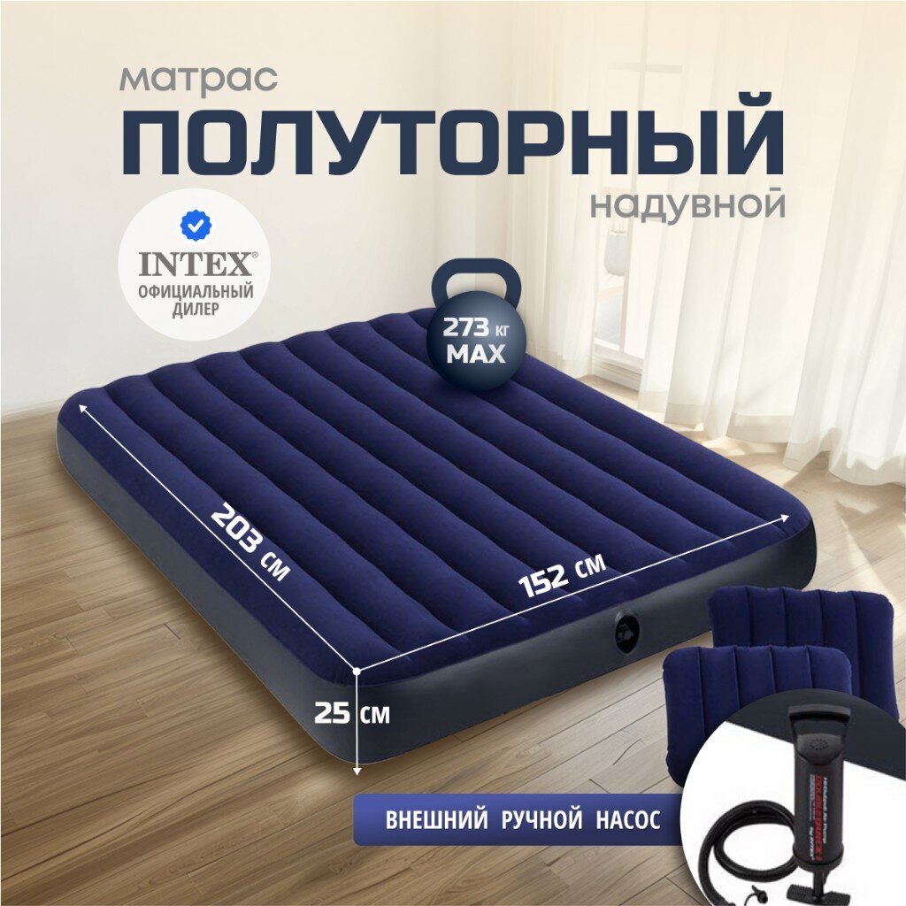 Вы можете приобрести «Матрас надувной Intex, 203х152х25 см, 64765, насос внешний, ручной, флокированный, с подушками, 273 кг» и другие товары в нашем интернет-магазине в Таганроге по низким ценам и с бесплатным самовывозом.