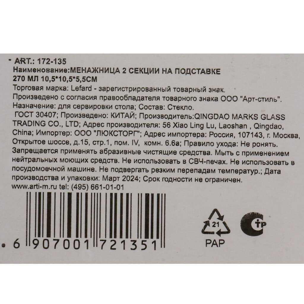 Менажница стекло, 10.5х5.5 см, 2 секции, на подставке, Lefard, 172-135
