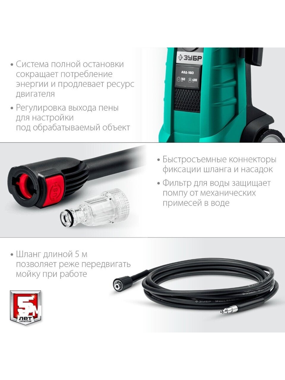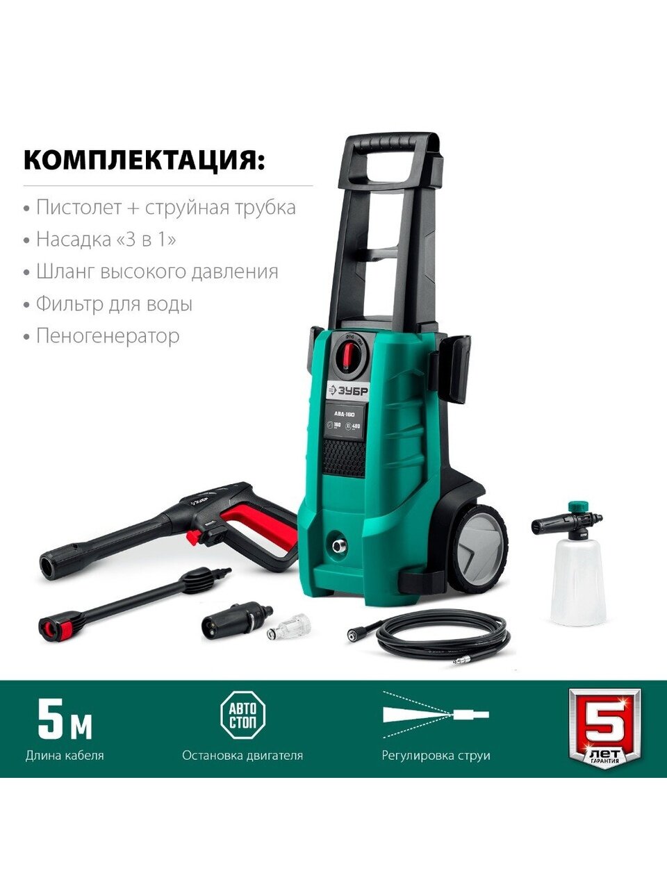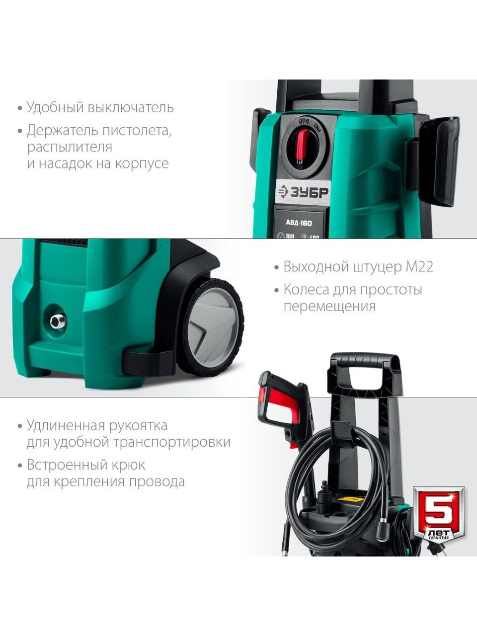 Зубр АВД-160 эффективное устройство для устранения загрязнений с помощью мощной струи воды. Благодаря функции автоматического отключения, насос не функционирует, если пистолет не задействован, что способствует экономии воды и продлевает срок службы аппарата. Эргономичный дизайн и продуманная конструкция с креплениями для дополнительных аксессуаров обеспечивают комфорт в процессе работы.