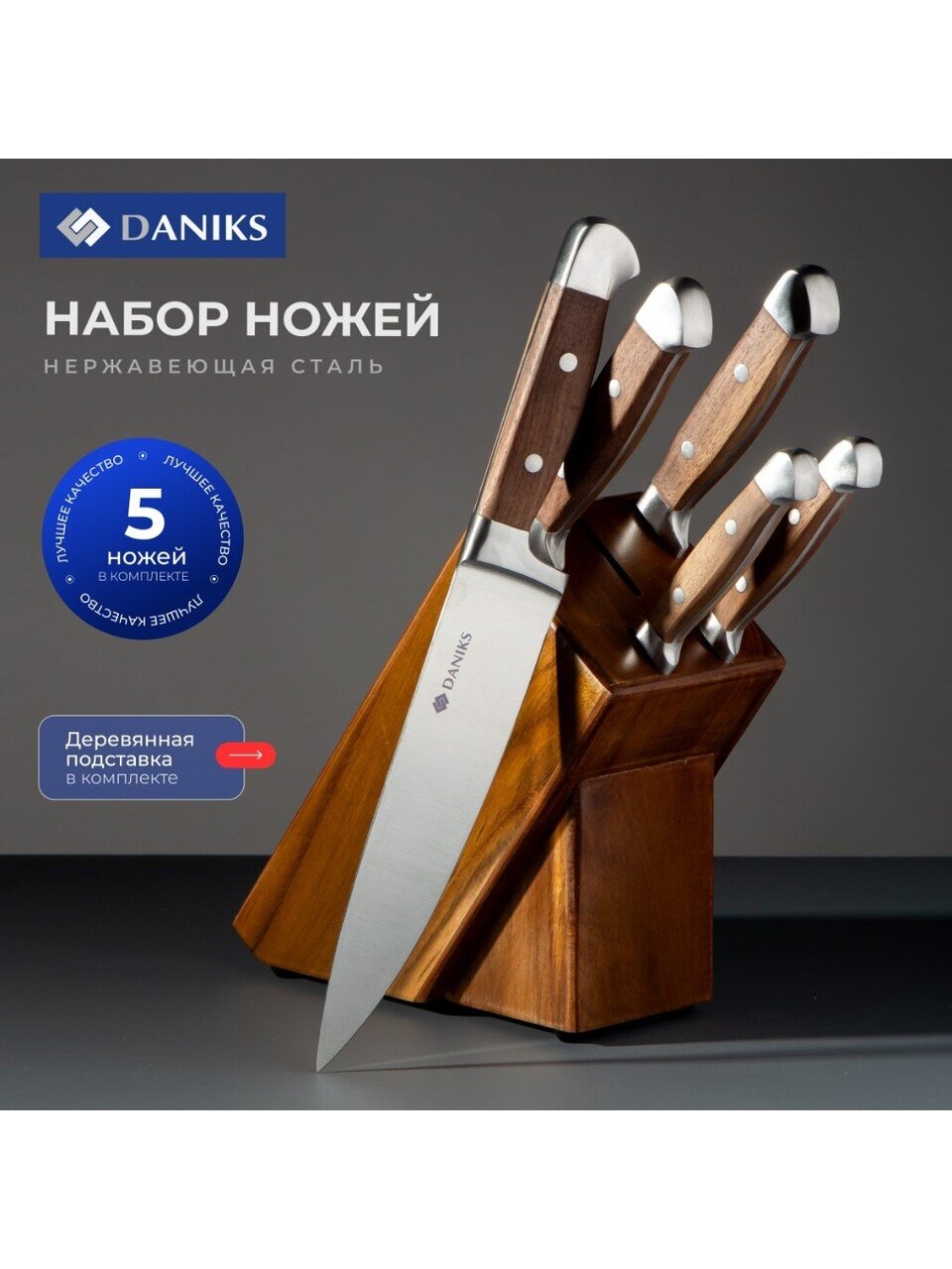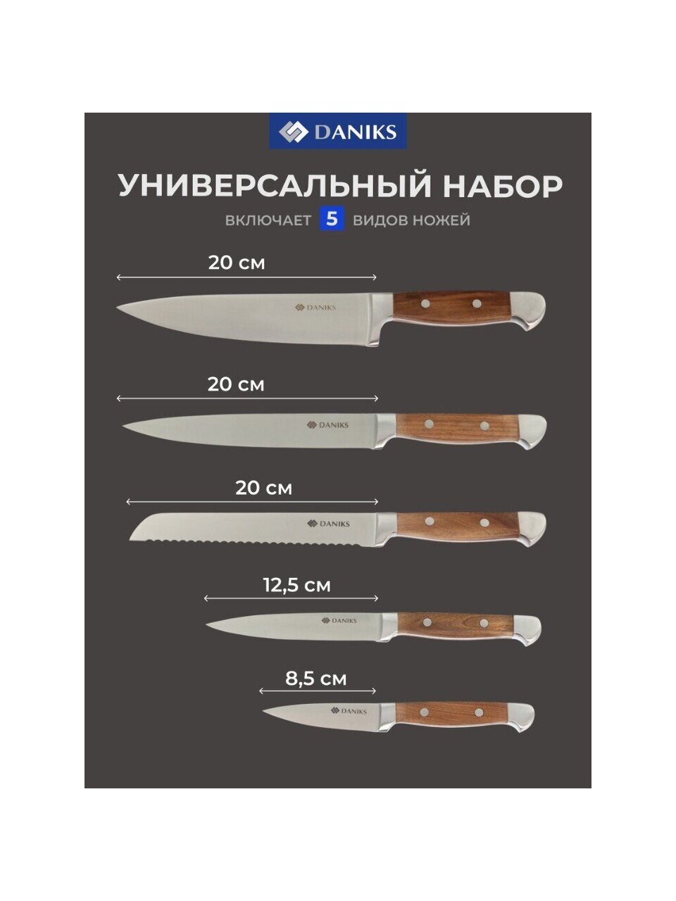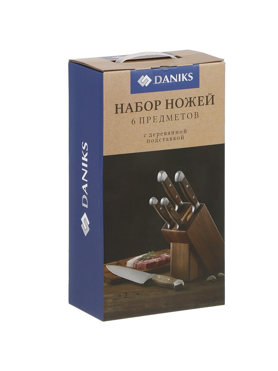 Вы можете приобрести «Набор ножей 6 предметов, 20,20,20,12.5,8.5 см, нержавеющая сталь, рукоятка нержавеющая сталь, с подставкой, дерево, Daniks, S-K4333» и другие товары в нашем интернет-магазине в Ельце по низким ценам и с бесплатным самовывозом.
