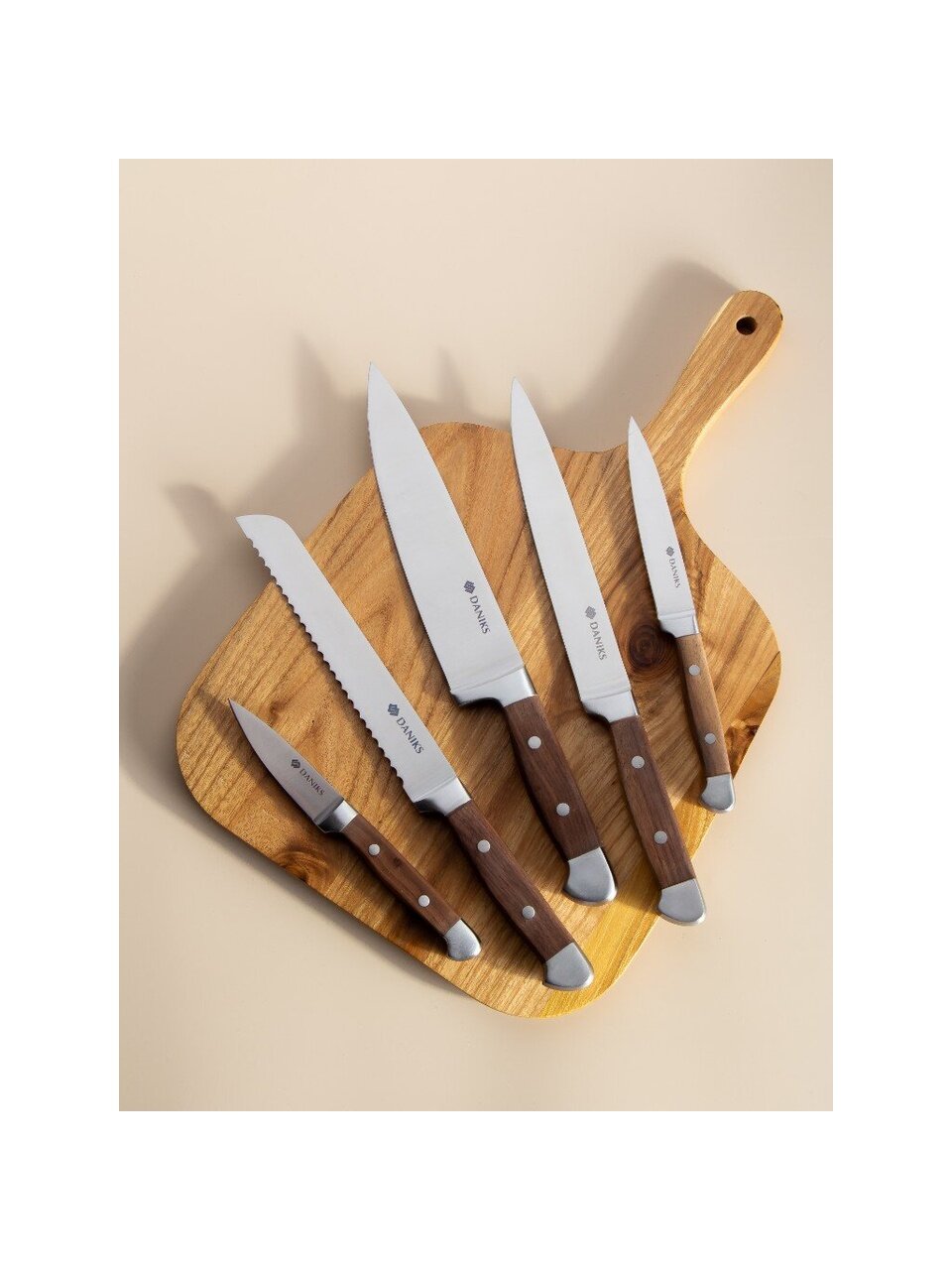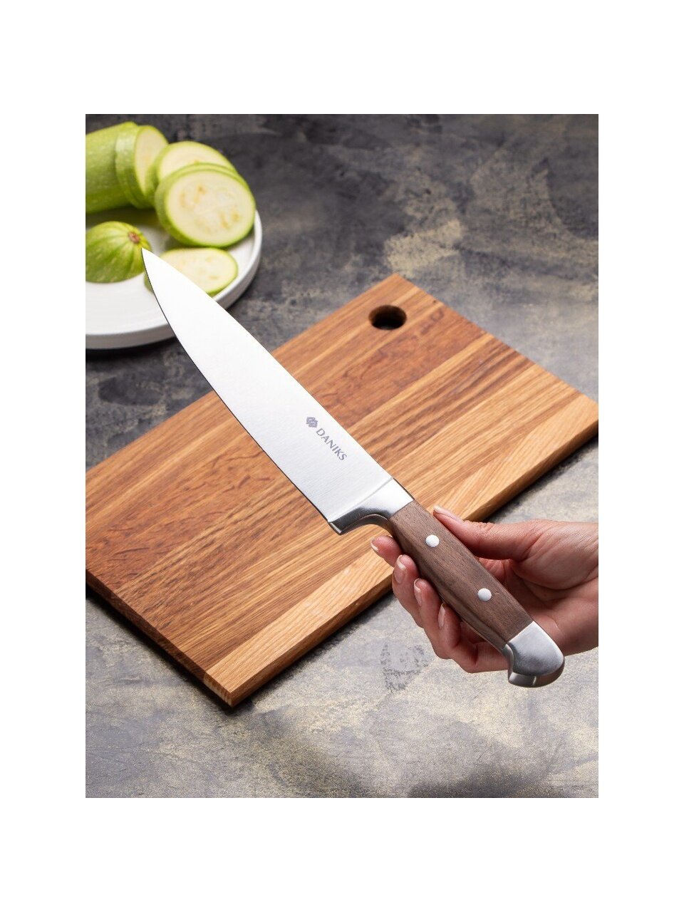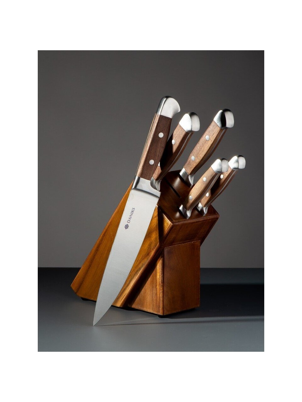 Комплектация набора позволяет с легкостью справляться с любыми кулинарными задачами: от нарезки хлеба до филигранной шинковки овощей и мяса. Стильная подставка обеспечивает компактное хранение, защищая ножи и поддерживая порядок на кухне. Благодаря эргономичной форме и оптимальному балансу ножи Daniks удобно лежат в руке, обеспечивая безопасность и контроль во время работы. Стильный коричневый цвет подставки гармонирует с любым интерьером кухни, а цельнометаллическая конструкция ручек подчеркивает надежность и прочность изделия.