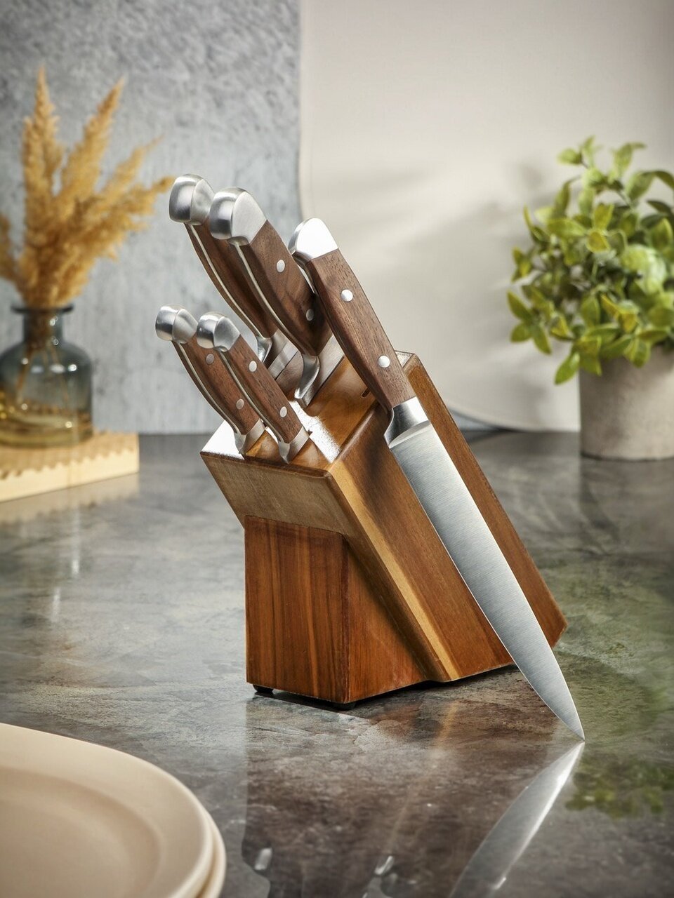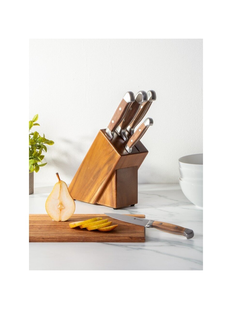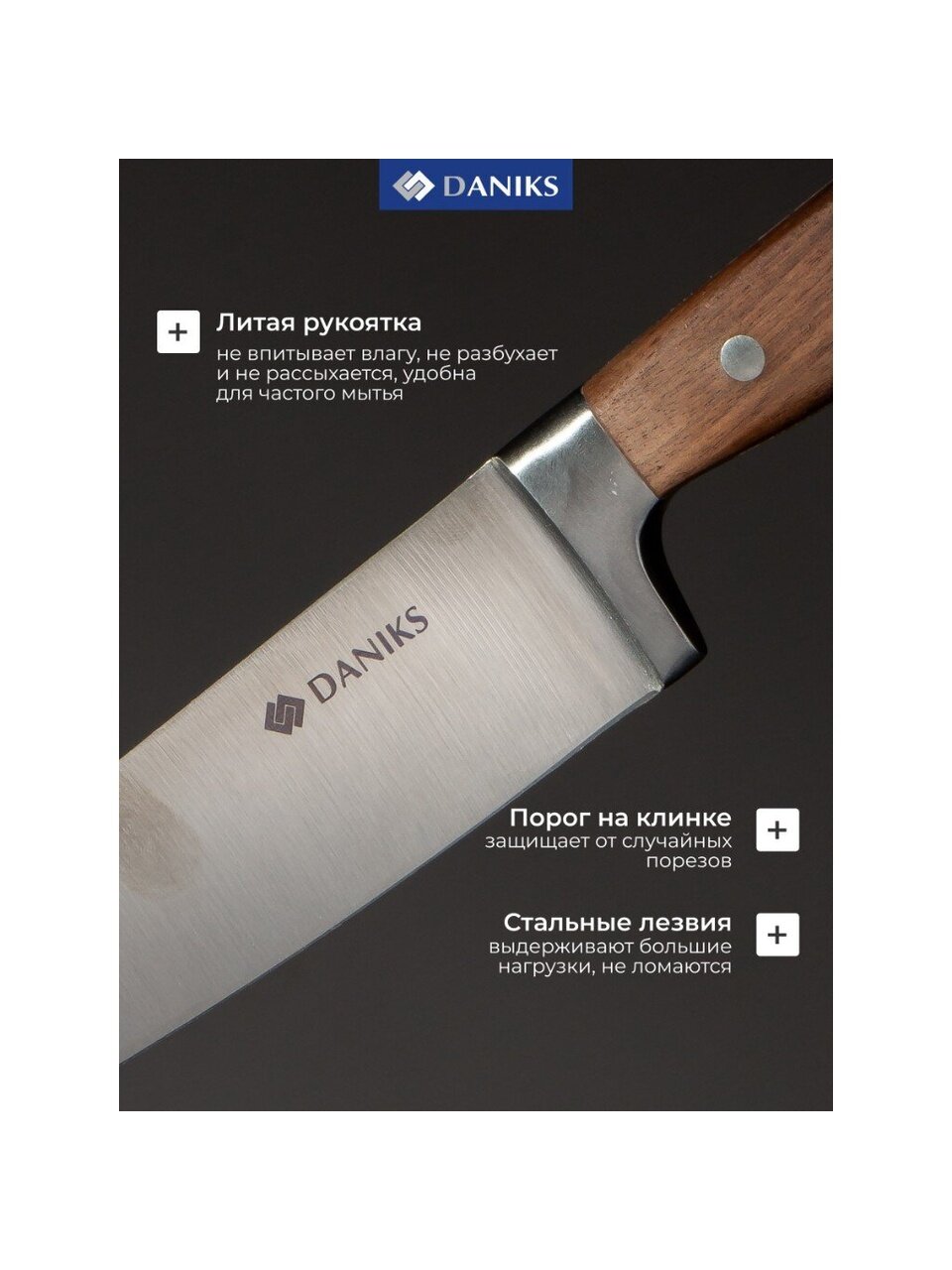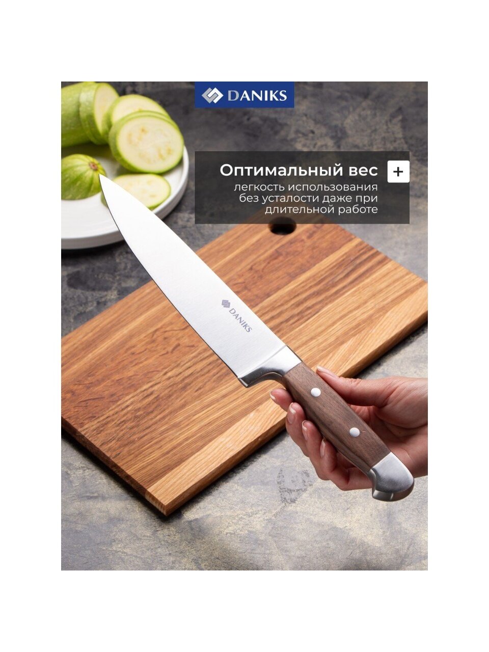 Комплектация набора позволяет с легкостью справляться с любыми кулинарными задачами: от нарезки хлеба до филигранной шинковки овощей и мяса. Стильная подставка обеспечивает компактное хранение, защищая ножи и поддерживая порядок на кухне. Благодаря эргономичной форме и оптимальному балансу ножи Daniks удобно лежат в руке, обеспечивая безопасность и контроль во время работы. Стильный коричневый цвет подставки гармонирует с любым интерьером кухни, а цельнометаллическая конструкция ручек подчеркивает надежность и прочность изделия.