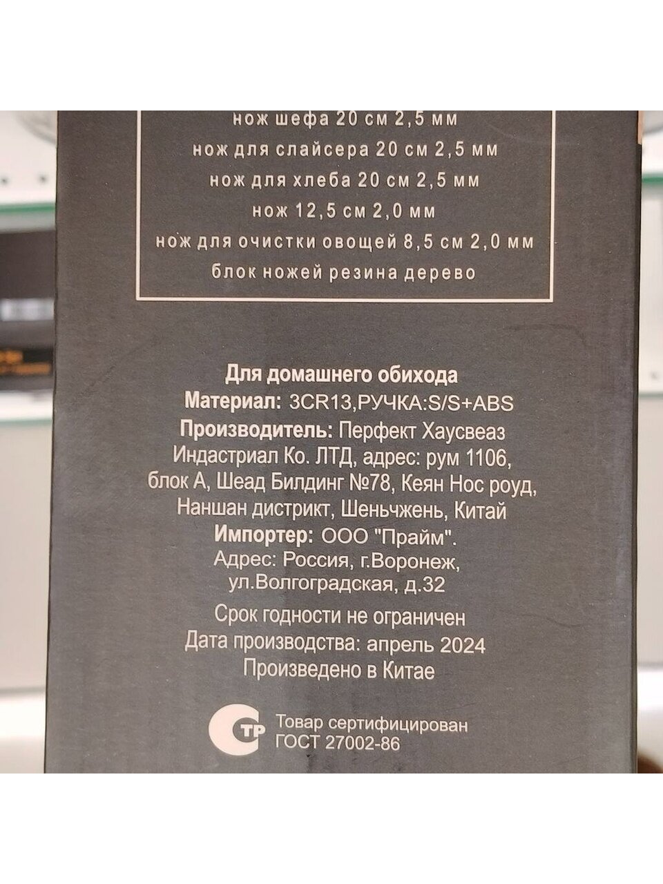 - универсальная комплектация: шеф-нож, нож для овощей, универсальный нож, хлебный нож, разделочный нож;