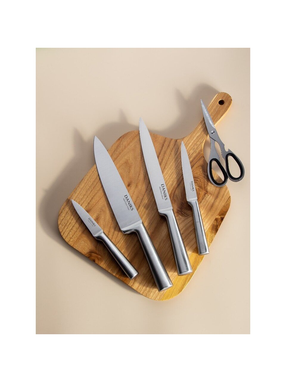 В комплект входят шеф-нож, нож для овощей, универсальный нож, ножницы и разделочный нож — все необходимые инструменты для кулинарных экспериментов и повседневных задач. Лезвия из нержавеющей стали гарантируют долговечность, остроту и устойчивость к коррозии, а эргономичные рукоятки из того же материала обеспечивают надежный хват и легкость в уходе. Благодаря возможности мытья в посудомоечной машине уход за набором становится максимально простым и удобным.