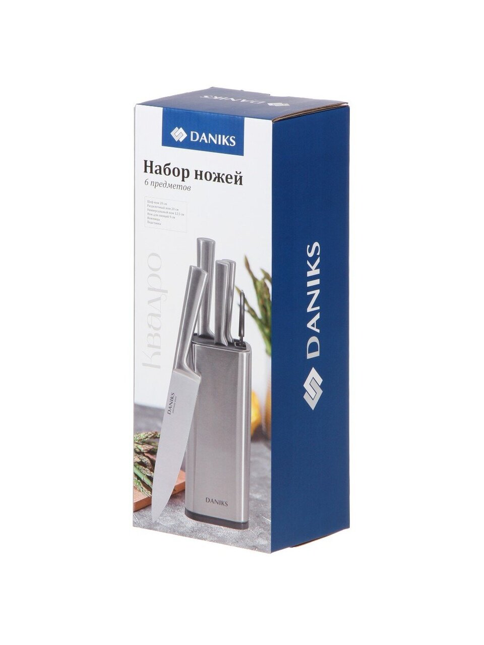 Идеальный выбор для современной кухни — набор ножей 6 предметов Daniks Квадро YW-A155-3. Элегантный дизайн в стиле хай-тек, цельнометаллическое исполнение и универсальность делают комплект незаменимым помощником для ежедневной готовки и стильным акцентом интерьера. Серебристый цвет и блеск нержавеющей стали подчеркивают статус и вкус владельца, а практичная подставка обеспечивает удобное и безопасное хранение.