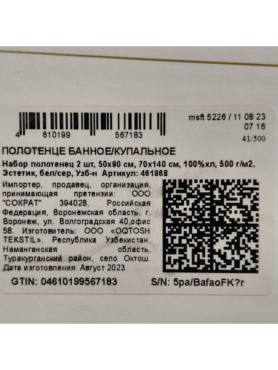 Вы можете приобрести «Набор полотенец 2 шт, 50х90, 70х140 см, 100% хлопок, 500 г/м2, Эстетика, бело-серый, Узбекистан» и другие товары в нашем интернет-магазине в Ельце по низким ценам и с бесплатным самовывозом.
