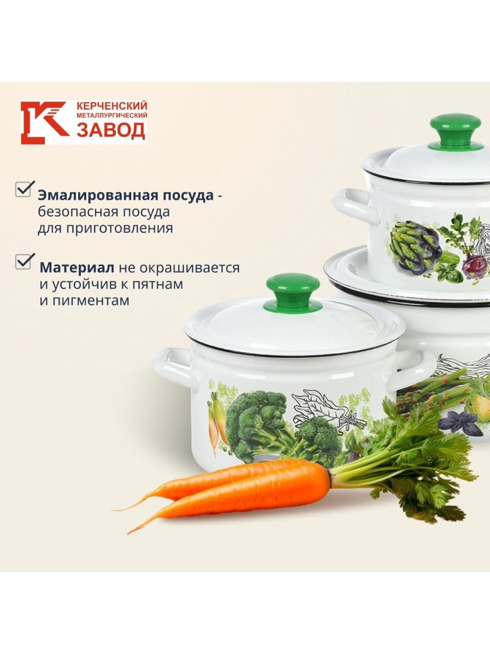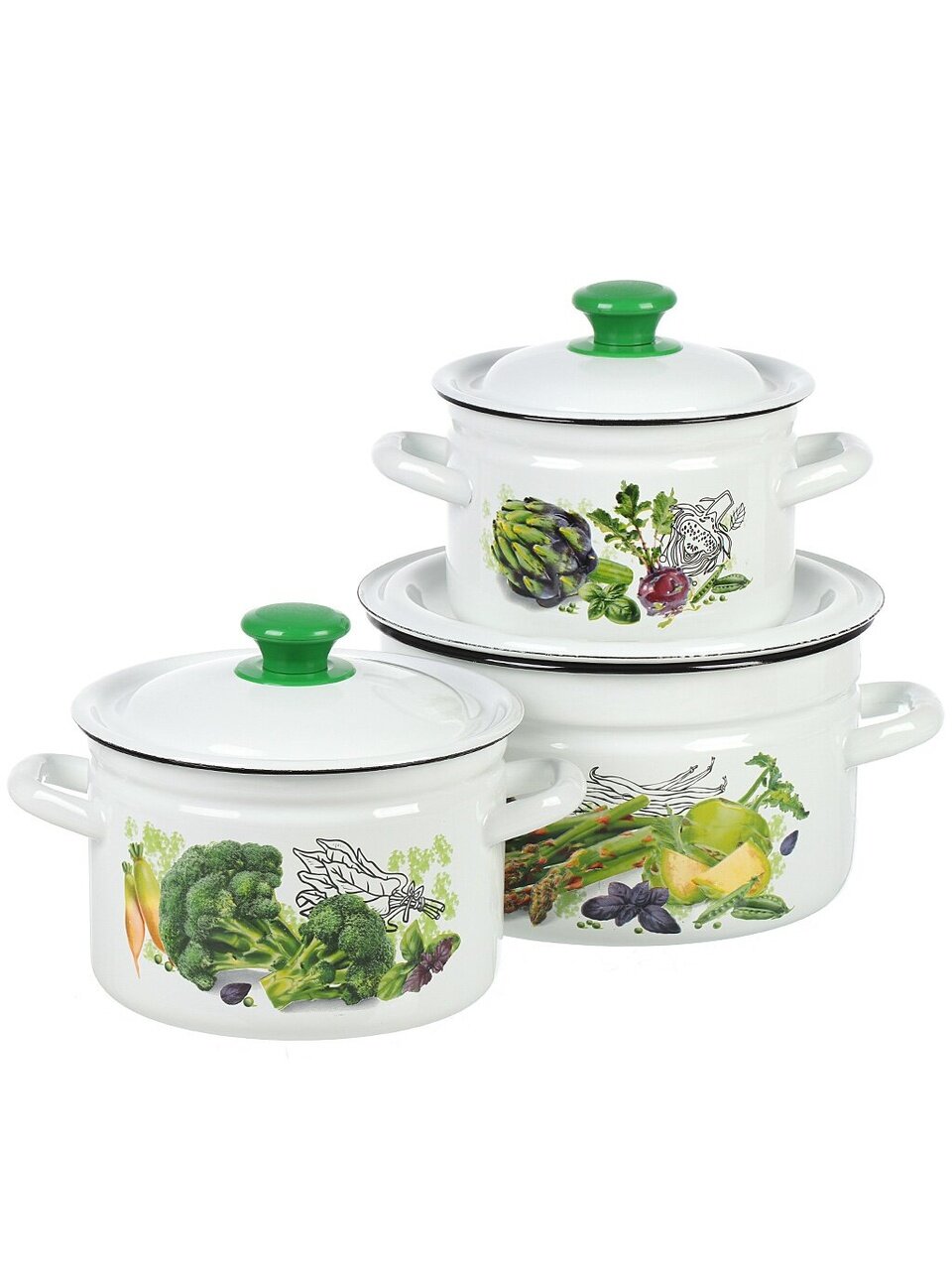 Закажите набор эмалированных кастрюль «Зеленые овощи-1» с доставкой — получите качественную посуду от российского производителя по доступной цене. Гарантия от завода и проверенная долговечность — ваш уверенный выбор для кухни и дачи.