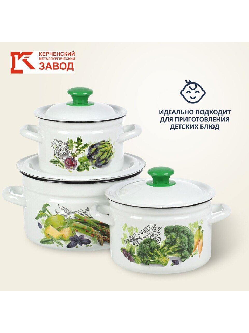 Набор эмалированных кастрюль 2/3/5 л. «Зеленые овощи-1» от Керченского металлургического завода — надежное решение для кухни и дачи по выгодной цене.