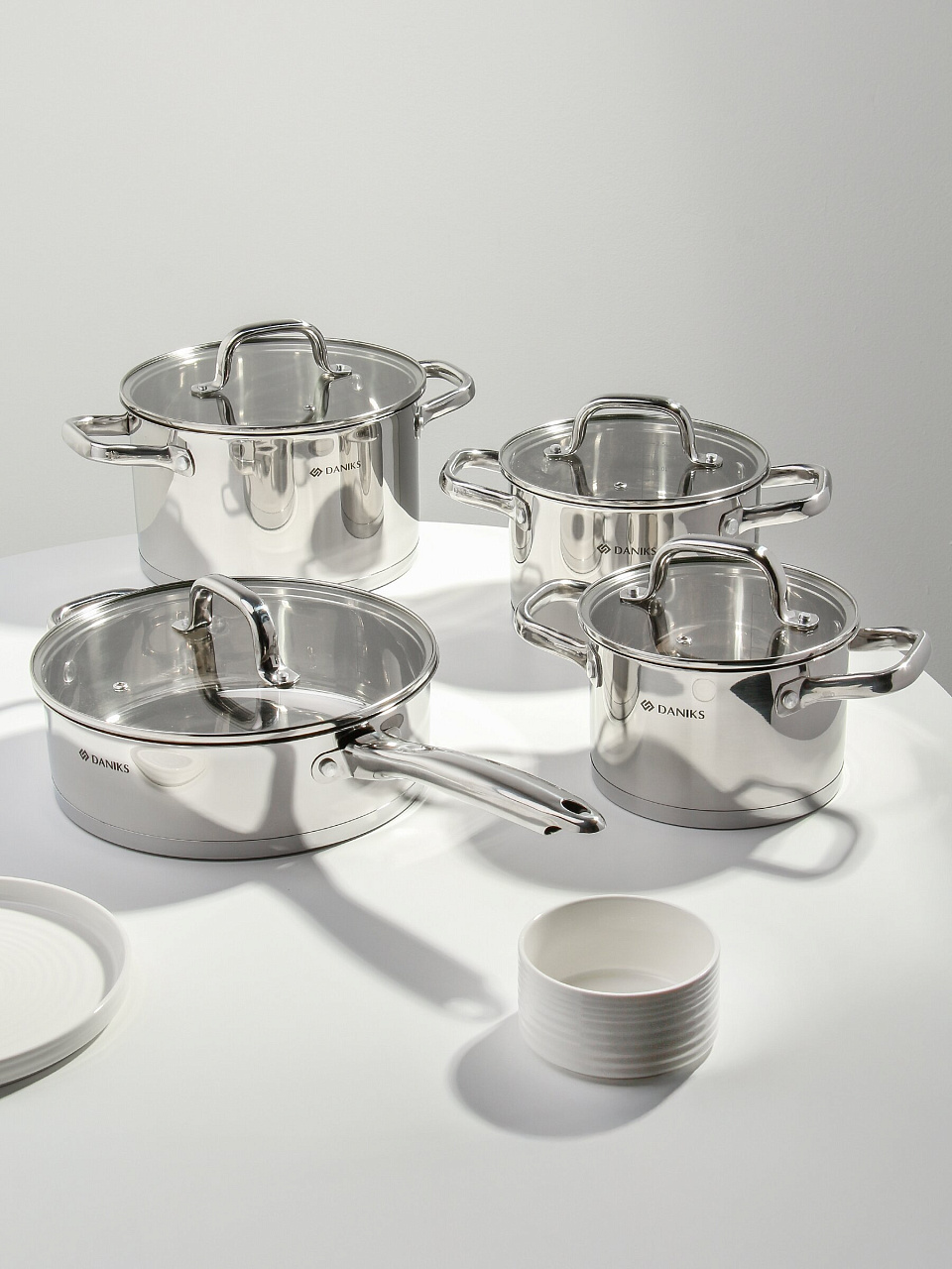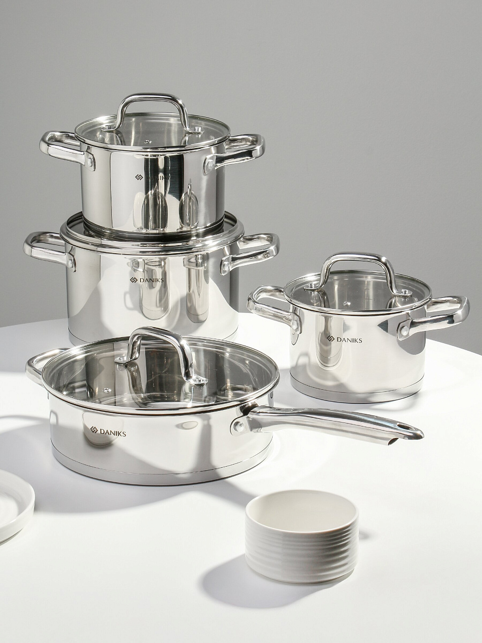 Набор посуды Daniks Рейн из нержавеющей стали: 8 предметов для индукции и всех типов плит. Практично для дома, дачи и подарка — готовьте любимые блюда без хлопот.