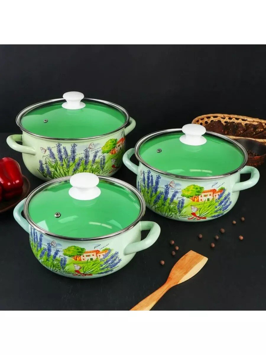 Корпус кастрюль выполнен из эмалированной стали, крышки — из прочного прозрачного стекла. В комплекте 6 предметов: 3 кастрюли и 3 крышки.