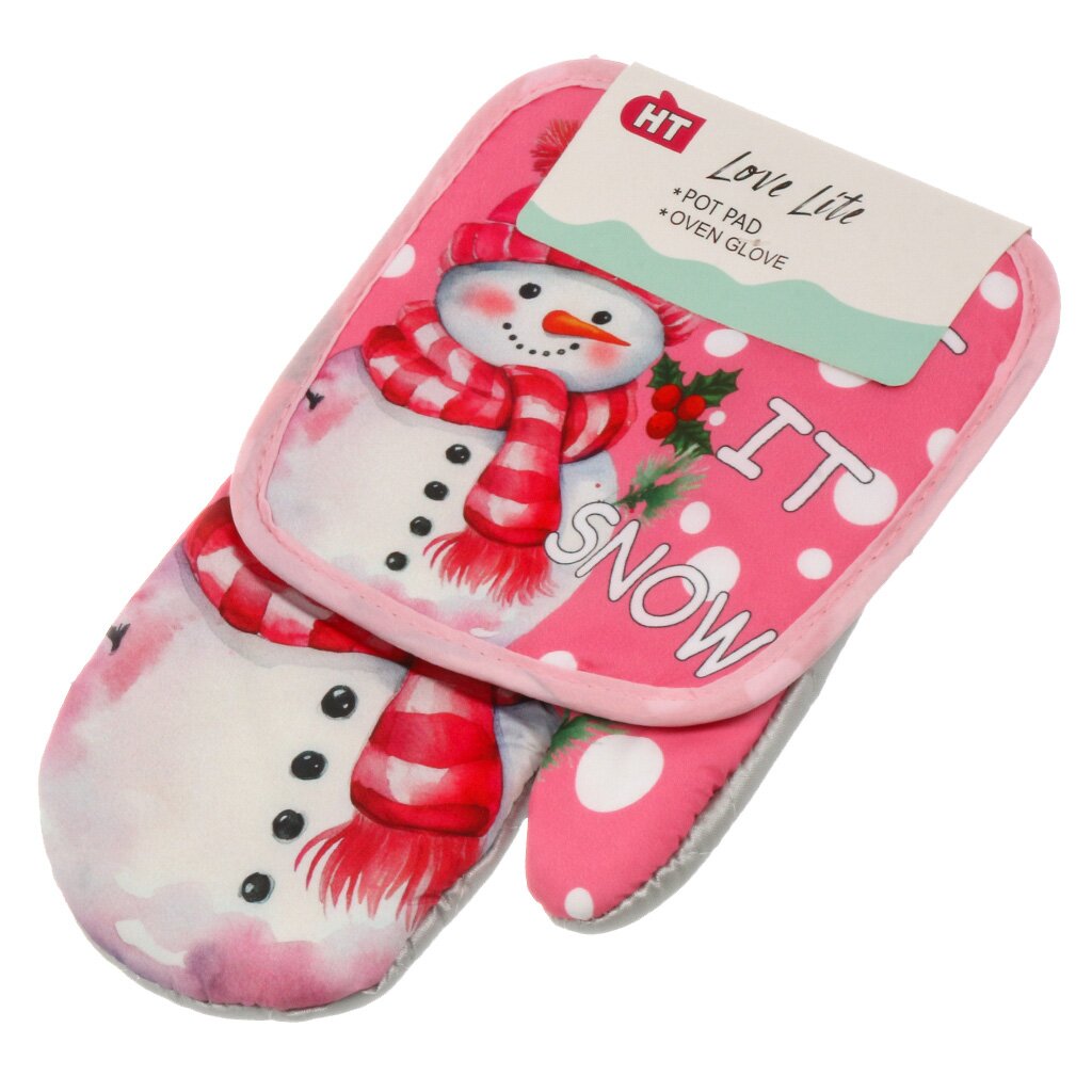 Набор кухонный 2 шт, 27х17см + 17.5х17.5см (варежка, прихватка), 100% полиэстер, Розовый снеговик, B180023